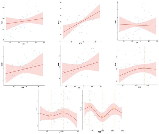 Further analysis using GAMs revealed nonlinear relationships and threshold effects between soil carbon components at varying depths, oxidative stability in Shenzhen’s urban forests, and environmental factors. For the 0–10 cm topsoil layer (Figure 5), the influence of the core soil factors exhibited significant nonlinear characteristics. SOC showed a “saturation threshold” association with VAC: when SOC was below 29 g·kg−1, VAC increased with rising SOC; once this threshold was exceeded, VAC sharply declined. This indicates that after the physical protection sites in the active carbon pool are depleted, additional carbon accelerates VAC mineralization through an excitation effect. In contrast, TN exhibited fluctuating associations with VAC, reflecting the complex interactions of nitrogen with acidification and microbial activity in urban environments. For the less active PAC and difficult-to-activate IAC, SOC and TN primarily influenced these components linearly. However, IAC was additionally regulated by thresholds for EC and NPP: when EC = 0.1 dS/cm, IAC decreased significantly due to enhanced microbial activity and aggregate disintegration; NPP reached the peak IAC value at 683.71 and dropped to its lowest at 991.81, demonstrating the critical role of balancing vegetation carbon input and microbial decomposition in inert carbon accumulation. In the 10–30 cm deep soil layer (Figure 6), factor effect patterns aligned more closely with the coupling characteristics between urbanization gradients and deep carbon cycling. SOC and TN exhibited linear relationships with VAC and AC, with SOC exerting stronger driving effects on both, thereby indicating that the dynamics of easily oxidizable carbon components in deeper layers depend more on the fundamental supply of soil carbon and nitrogen pools. The threshold effects of urbanization-related factors became prominent: DM reached its minimum at 29,530 m, where AC dropped to its lowest value, reflecting stronger consumption of AC in deeper layers in suburban areas. NL exhibited alternating peaks and troughs in its influence on PAC, peaking at 30.11 and bottoming out at 52.59, illustrating how urbanization intensity disrupted the physical protection of low-activity carbon. Additionally, FVC demonstrated divergent effects: it linearly promoted PAC but showed a “peak threshold” for IAC. IAC peaked at FVC = 82.58% and declined thereafter. This indicates that moderate vegetation cover promotes inert carbon accumulation by lowering the soil temperature and enhancing aggregate protection; however, excessive cover may diminish this effect owing to root exudate-induced decomposition.