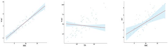 PLS-SEM clarified the direct and indirect pathways influencing the factors. Soil factors (SOC and TN) had significant direct effects on all oxidized carbon components, serving as core regulators. Precipitation influenced carbon components by regulating soil SOC and TN content. Shenzhen, characterized by a subtropical monsoon climate with abundant rainfall, experiences high-intensity precipitation that reduces soil SOC and TN reserves through two pathways: physical erosion-leaching and aggregate destruction. Rainfall runoff causes particulate organic carbon loss, whereas dissolved organic carbon migrates to deeper soil layers. Short-term flooding induces anaerobic conditions that reduce carbon mineralization while promoting denitrification, resulting in TN loss [6]. Furthermore, rainfall decreases the proportion of large soil aggregates, reducing their protective function for organic carbon and consequently decreasing soil carbon and nitrogen contents [42]. Although rainfall decreases soil carbon and nitrogen contents, SOC increases extracellular enzyme activity, thereby accelerating the transformation of active carbon fractions. TN increases microbial biomass carbon by reducing the soil C/N ratio [43]. Urbanization factors indirectly affect inert carbon fractions by altering vegetation characteristics; increased urbanization intensity reduces the physical protection of PAC by disrupting the aggregate structure. Elevation [44] and slope [45] indirectly influence SOC and TN accumulation by regulating local hydrothermal conditions, thereby affecting the carbon fractions. This “direct soil-driven–indirect human-regulated” pathway reflects the deep coupling between natural processes and human disturbances in urban ecosystems [13]. The findings of this study not only align with the fundamental principles governing carbon fraction regulation in natural ecosystems but also highlight the unique characteristics of urban environments. The soil VAC fraction can serve as an indicator of SOC quality in agricultural systems [29]. This study indicates that the high coefficient of variation (38.05–48.50%) of VAC in urban forests, along with its nonlinear relationship with SOC, renders it a sensitive indicator of urban soil carbon quality variation, thereby broadening the application scenarios of the VAC fraction. Furthermore, in contrast to natural ecosystems, anthropogenic inputs, such as salts and pollutants, in urban environments increase regulatory complexity. This introduces urban-specific factors into the driving network of highly stable components, aligning with the conclusion that “urban soil carbon cycling is dominated by human disturbance [9].”