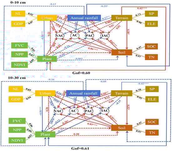 PLS-SEM effectively identifies complex relationships among factors, conducts factor analysis within the model to explain the relationships between latent and observed variables, and screens out the primary drivers of changes in soil oxidized carbon components. This model employs path diagrams in the structural model to illustrate the relationships among latent variables. After multiple fitting analyses and debugging, we constructed a PLS-SEM that included the following variables: climate, vegetation, topography, urbanization, and soil factors. Model accuracy was assessed using goodness-of-fit indices (GoF), loadings (Loading), and p-values. A GoF ≥ 0.36 indicated a strong fit [17], with a loading threshold of 0.7. Statistical significance was set at p < 0.05 [27].
