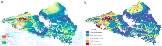 (a) Biodiversity conservation function importance assessment results; (b) Biodiversity conservation function importance grading.