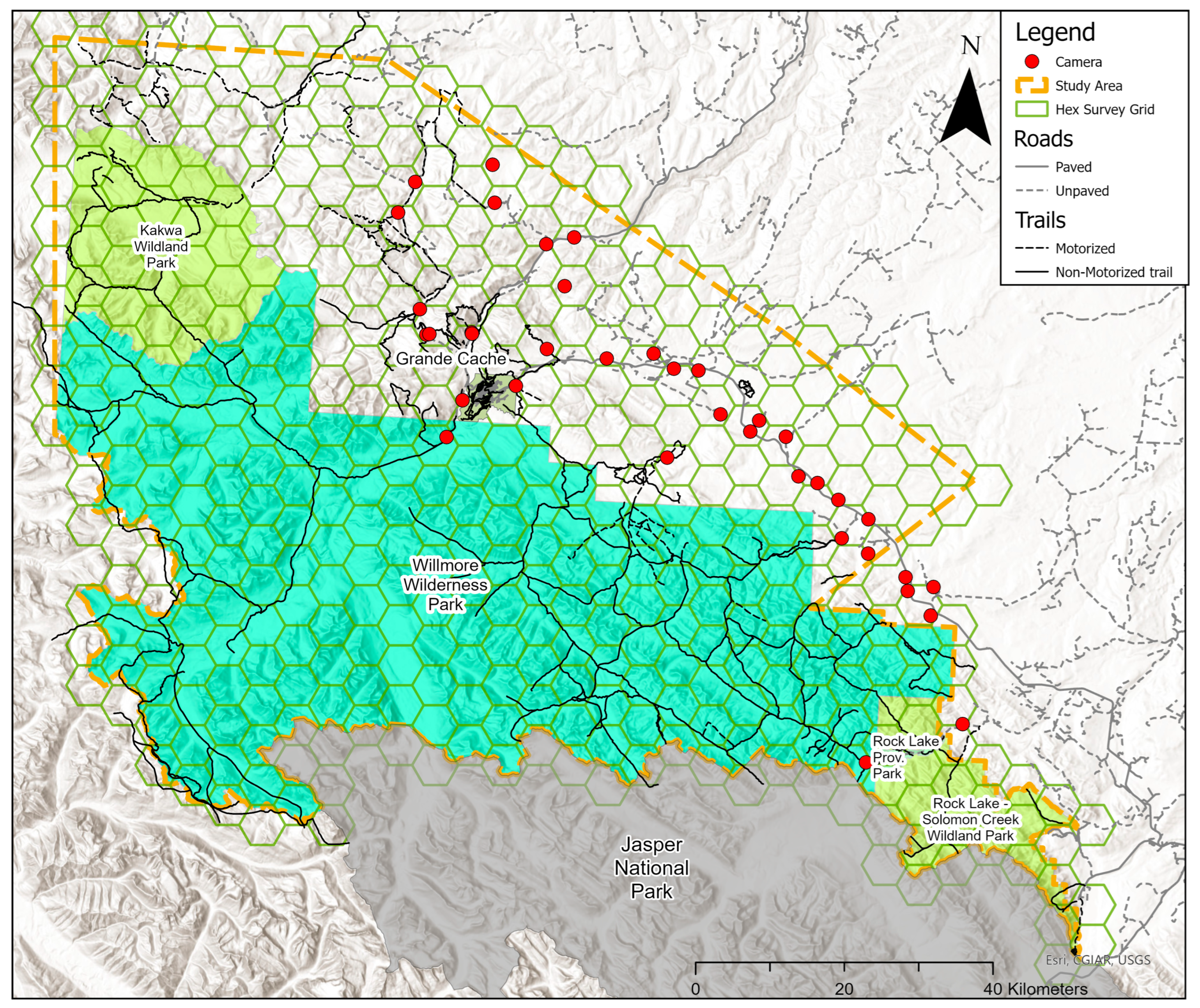 - Thompson, P.R.; Paczkowski, J.; Whittington, J.; St. Clair, C.C. Integrating Human Trail Use in Montane Landscapes Reveals Larger Zones of Human Influence for Wary Carnivores. J. Appl. Ecol. 2025, 62, 344–359. [Google Scholar] [CrossRef]