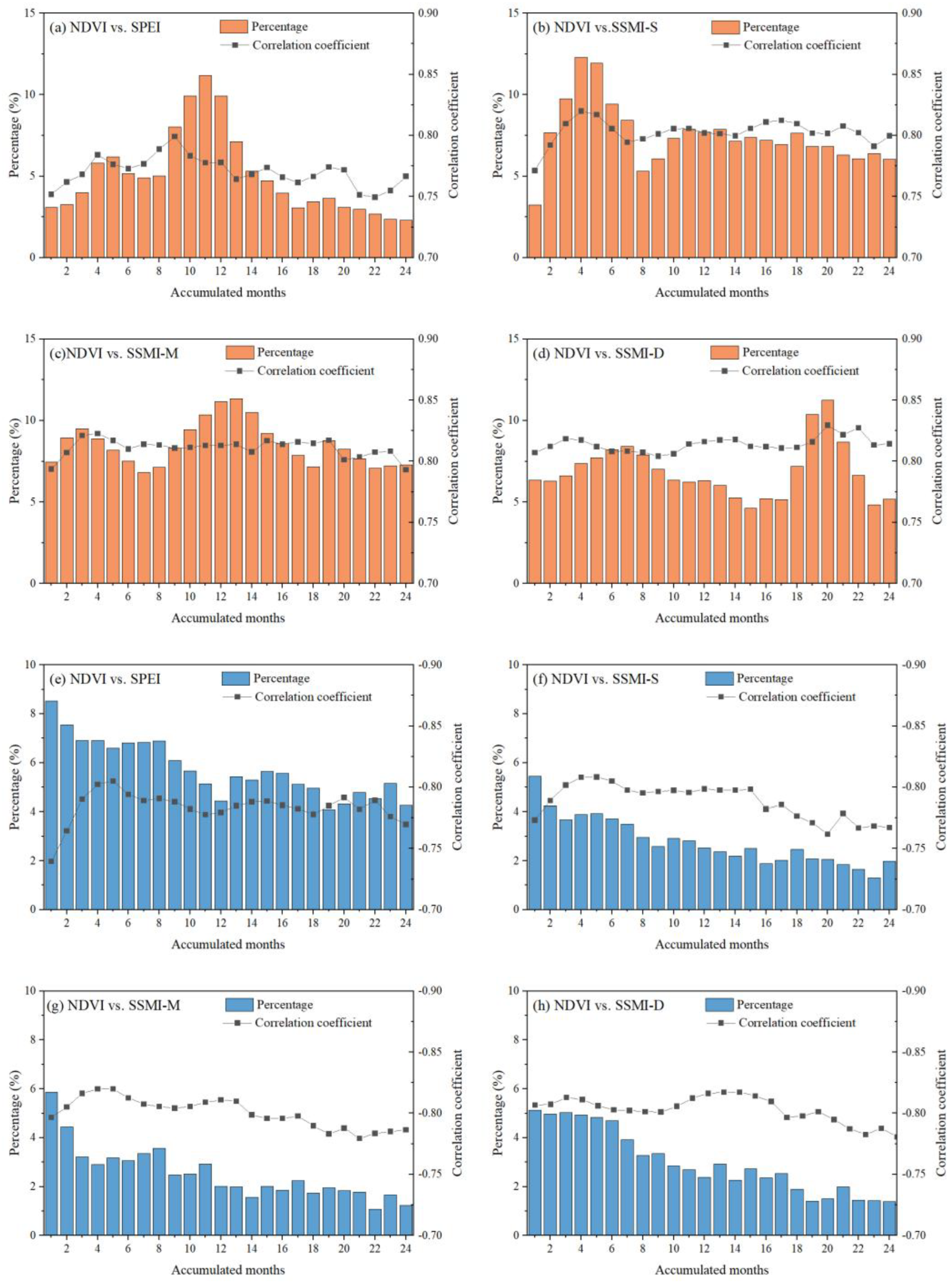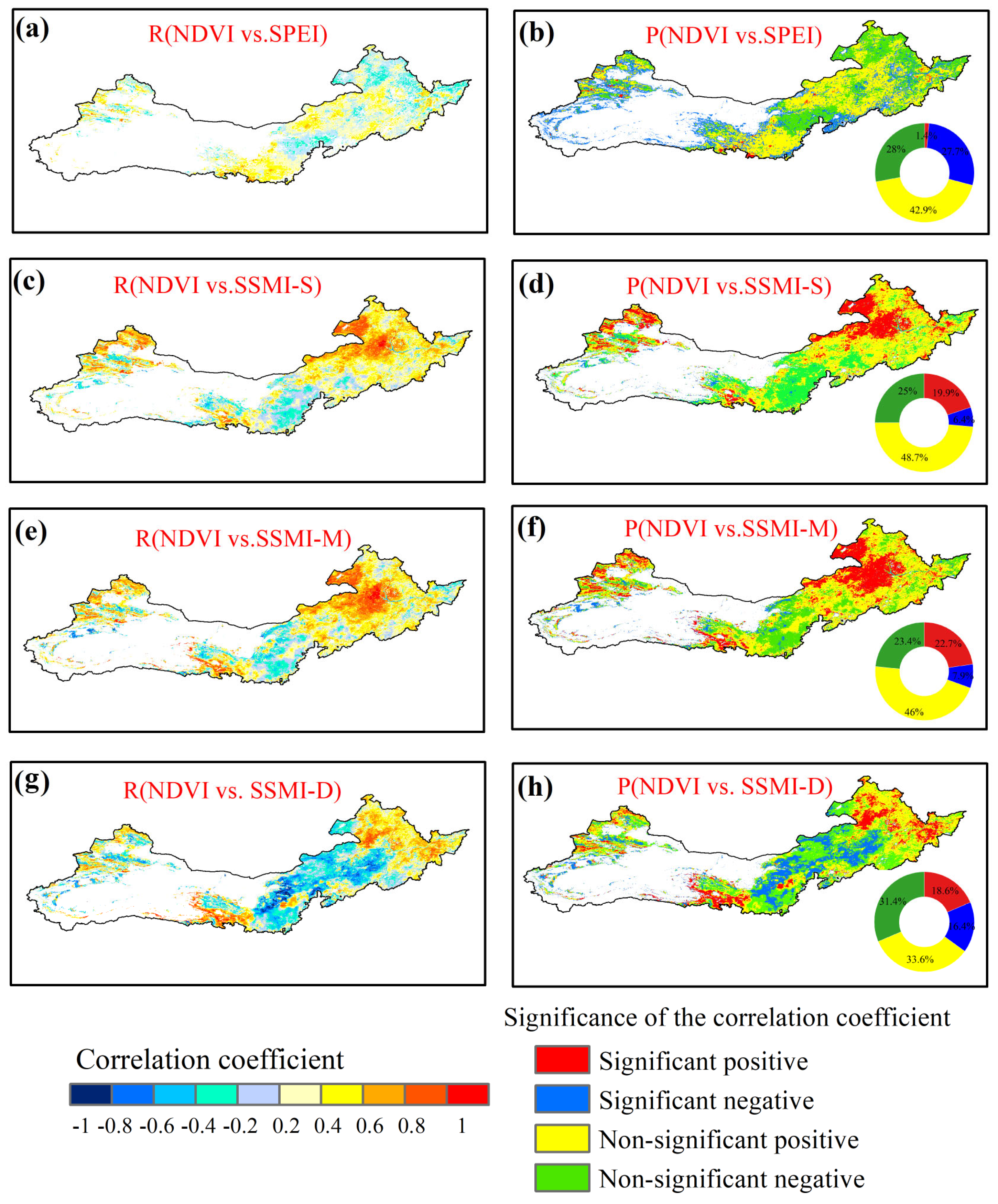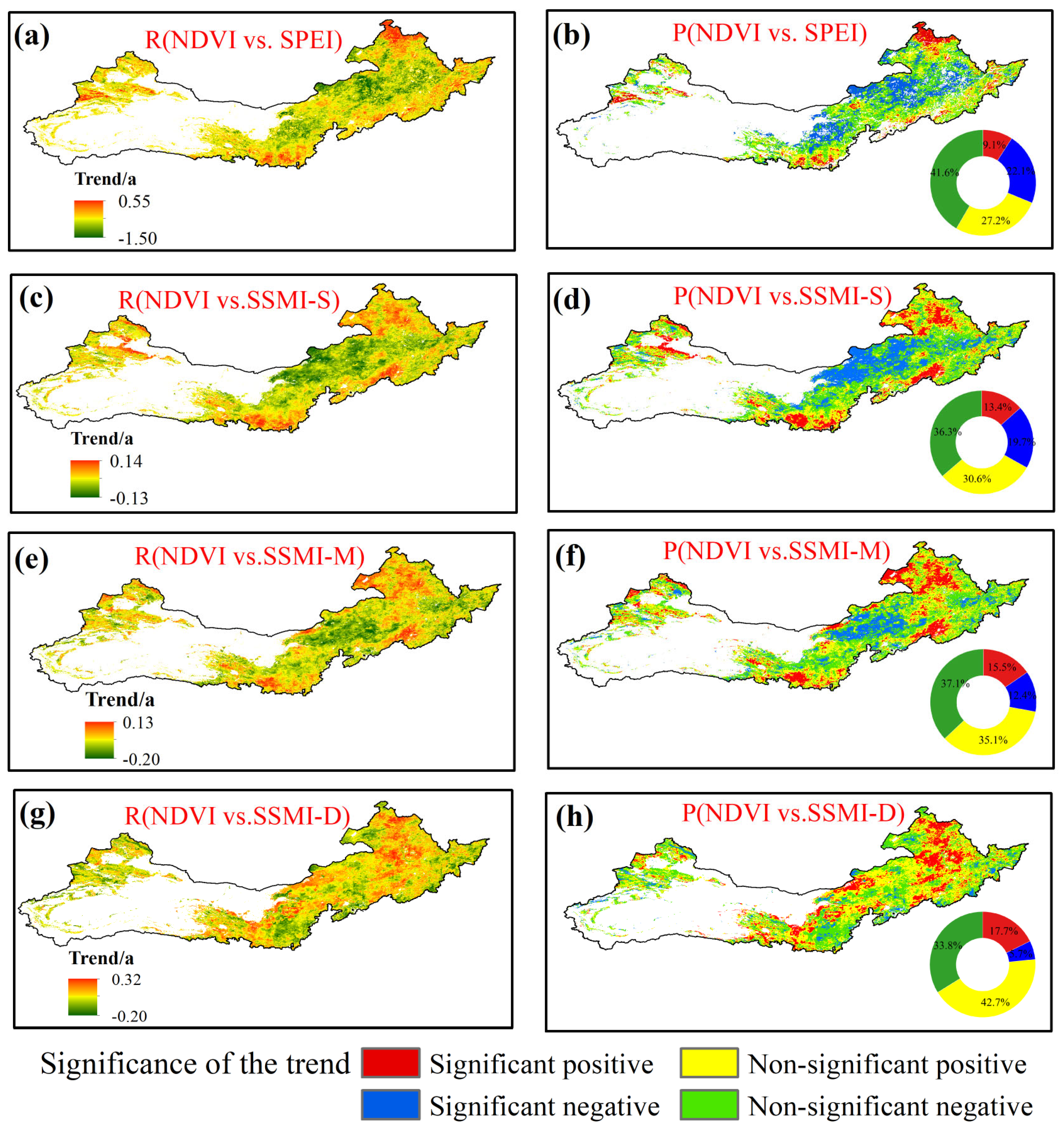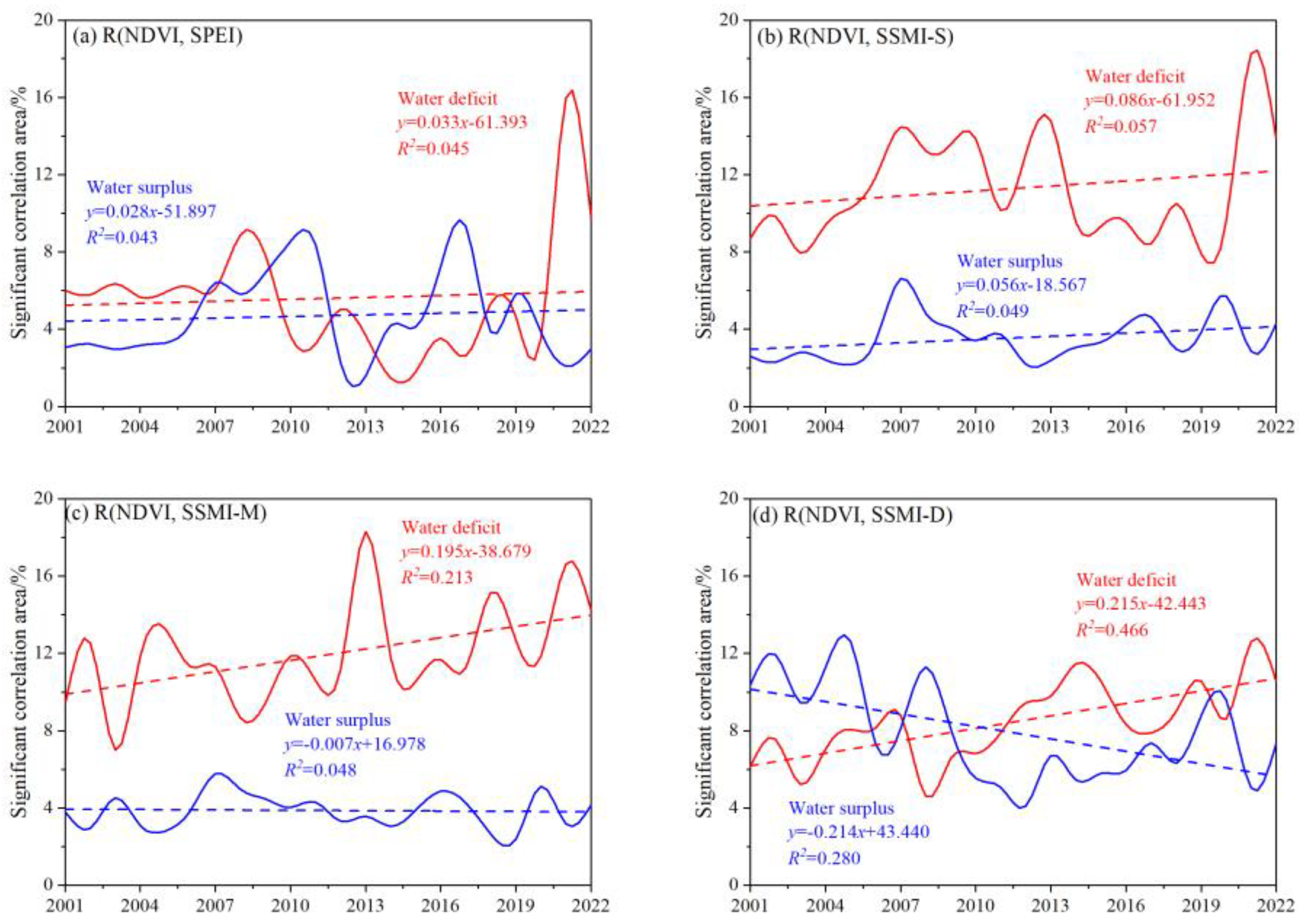 3.2. Temporal Variations in Correlations Between Vegetation and Water Availability