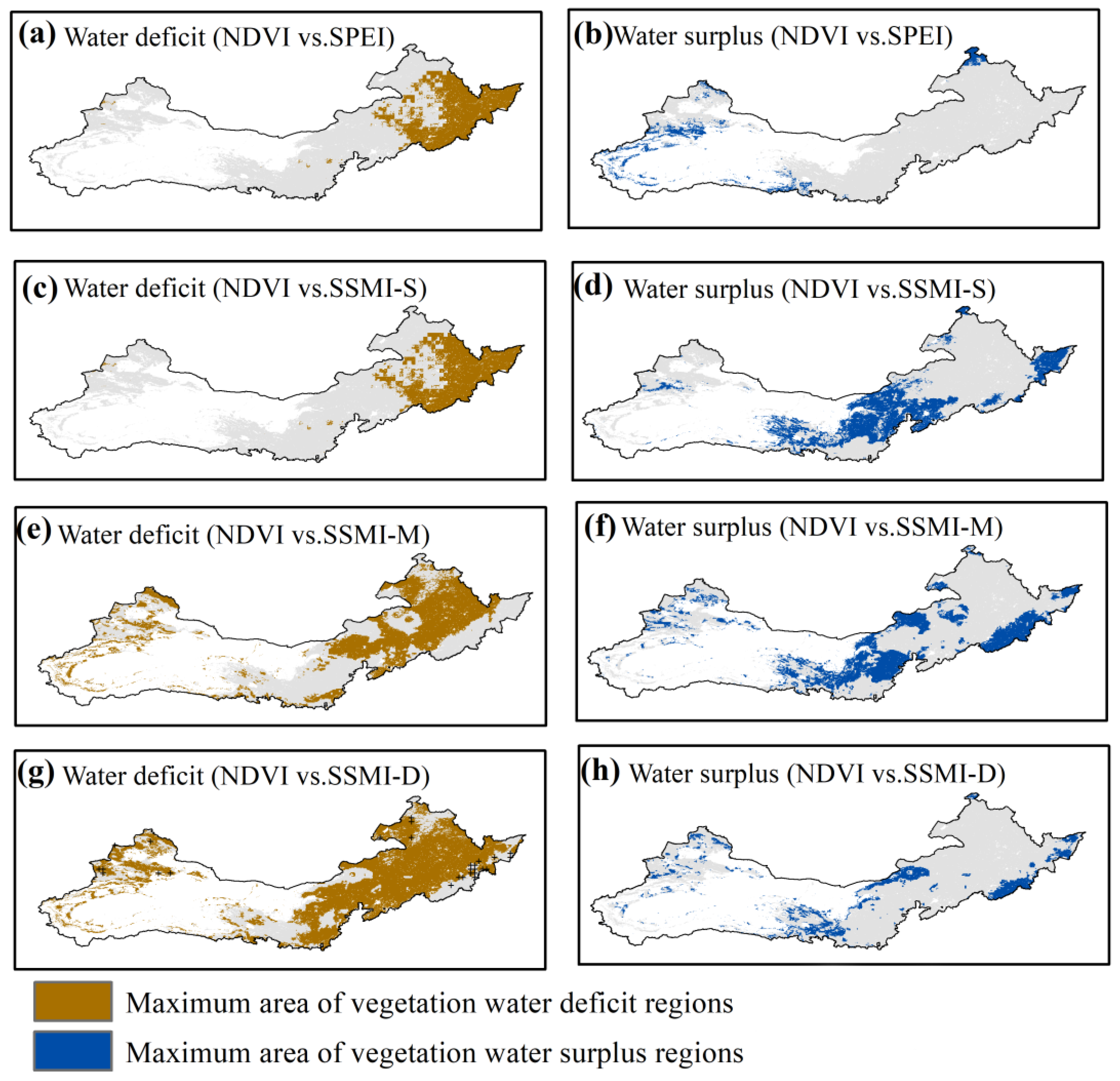 - Sun, H.; Cheng, Y.; Liu, L.; An, Q.; Zhang, H. Water deficit is increasingly limiting vegetation productivity in China. Ecol. Indic. 2025, 177, 113775. [Google Scholar] [CrossRef]