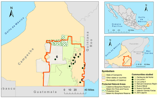Map of studied communities and Natural Protected Areas in the municipality of Calakmul, Mexico. Source: Karina Noemí Chale Silveira.