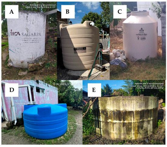 The most common types of water storage containers used in households in the Calakmul Municipality. (A) 5000 L (approx.) ferrocement cistern, (B) 10,000 L plastic cistern, (C) 2500 L (approx.) plastic cistern, (D) 5000 L plastic cistern, (E) 10,000 L ferrocement cistern.
