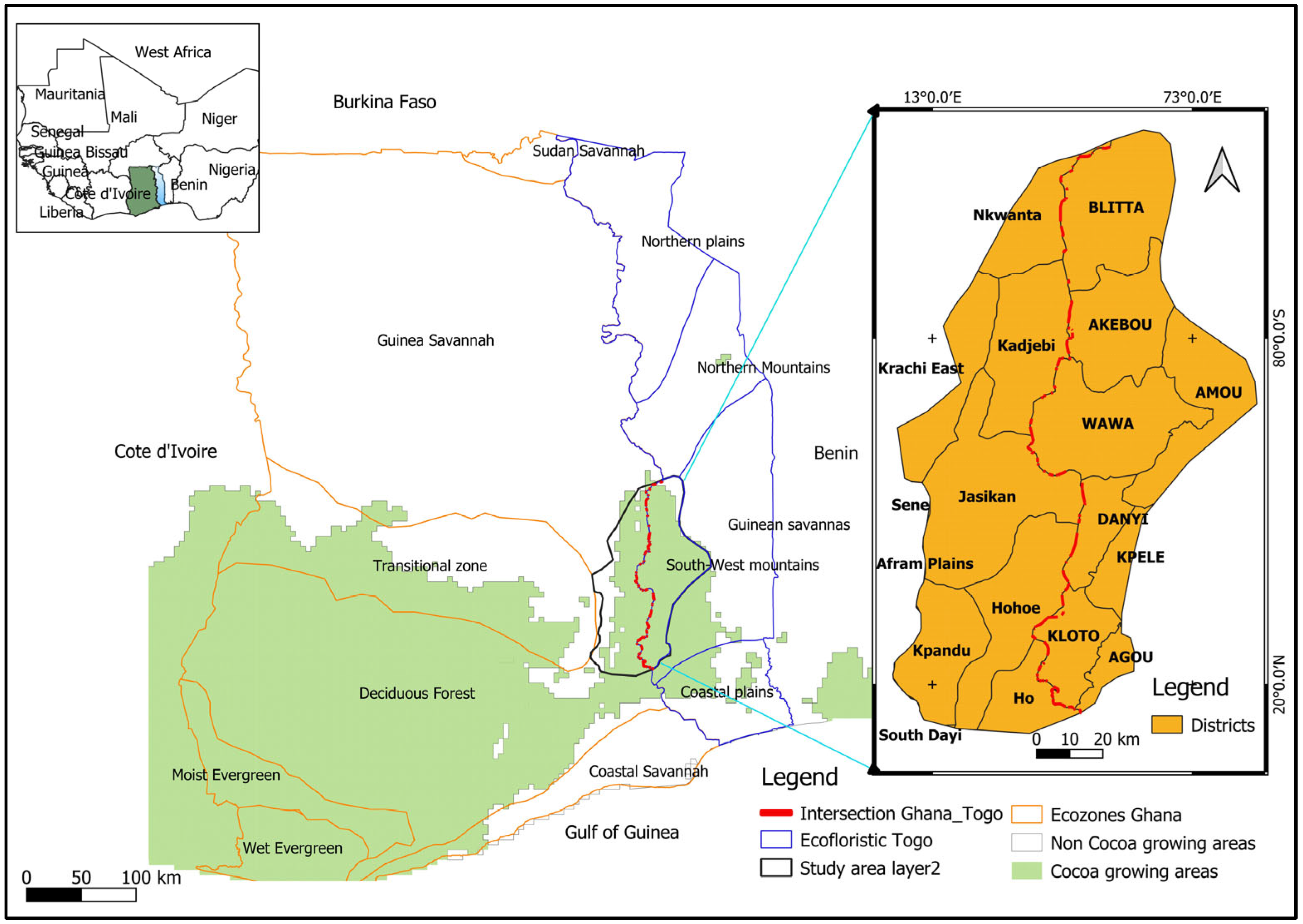 - Ruf, F.; Schroth, G.; Doffangui, K. Climate Change, Cocoa Migrations and Deforestation in West Africa: What Does the Past Tell Us about the Future? Sustain. Sci. 2015, 10, 101–111. [Google Scholar] [CrossRef]