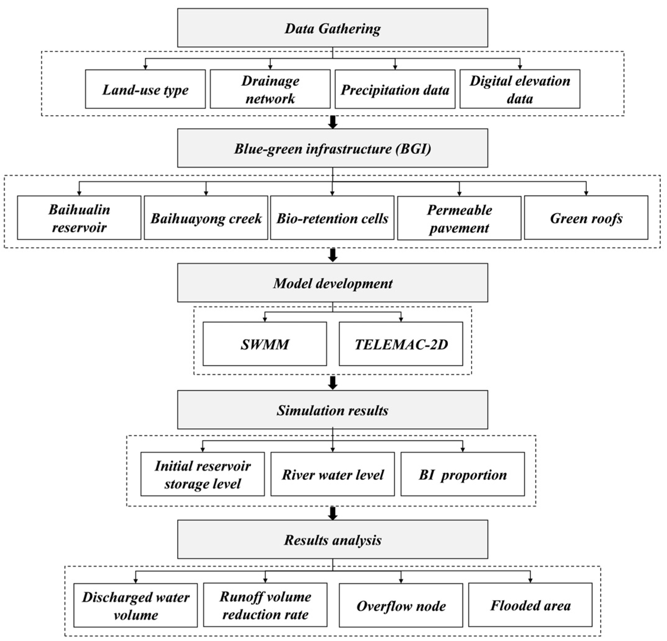 53] have examined the hydrological benefits of GI or BI individually, the synergistic effects of integrated reservoir operation, river water level regulation, and GI at the watershed scale remain insufficiently quantified. This study employs the Baihuayong creek watershed in Zengcheng District, Guangzhou, China, as a representative case study. A watershed and urban stormwater model were constructed based on the SWMM and TELEMAC-2D, using the entire watershed as the foundation and BGI as the research subject. The study evaluates the stormwater control performance of BGI under six rainfall events, varying initial reservoir storage levels, river water levels, and proportions of GI construction. Based on the quantitative results of this study, a scientific basis can be provided for urban watersheds in the Pearl River Delta region or other cities with similar natural geographical conditions and urbanization development patterns.