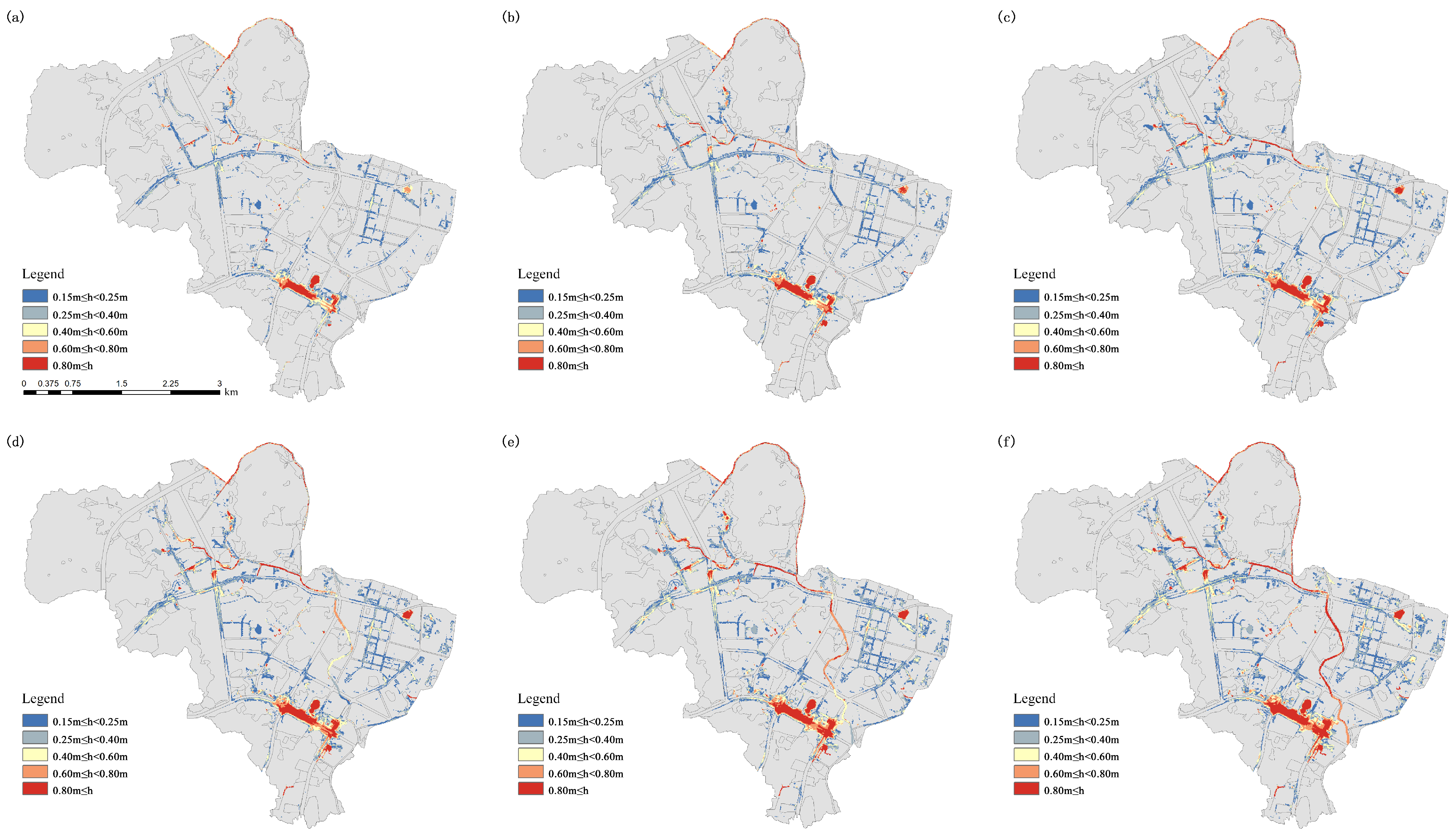 Although the hydrological simulation includes the entire Baihuayong watershed, the resulting flooding analysis primarily focused on the built-up areas. This is because rural and upstream green-space regions typically possess higher infiltration capacities, natural drainage, and are less vulnerable to surface ponding. Moreover, flooding in non-urban areas often does not result in significant economic loss or infrastructure damage. Therefore, the focus of this study on analyzing the inundation extent of built-up areas is considered more relevant and can better guide the improvement of urban flood resilience and the optimization of infrastructure deployment.