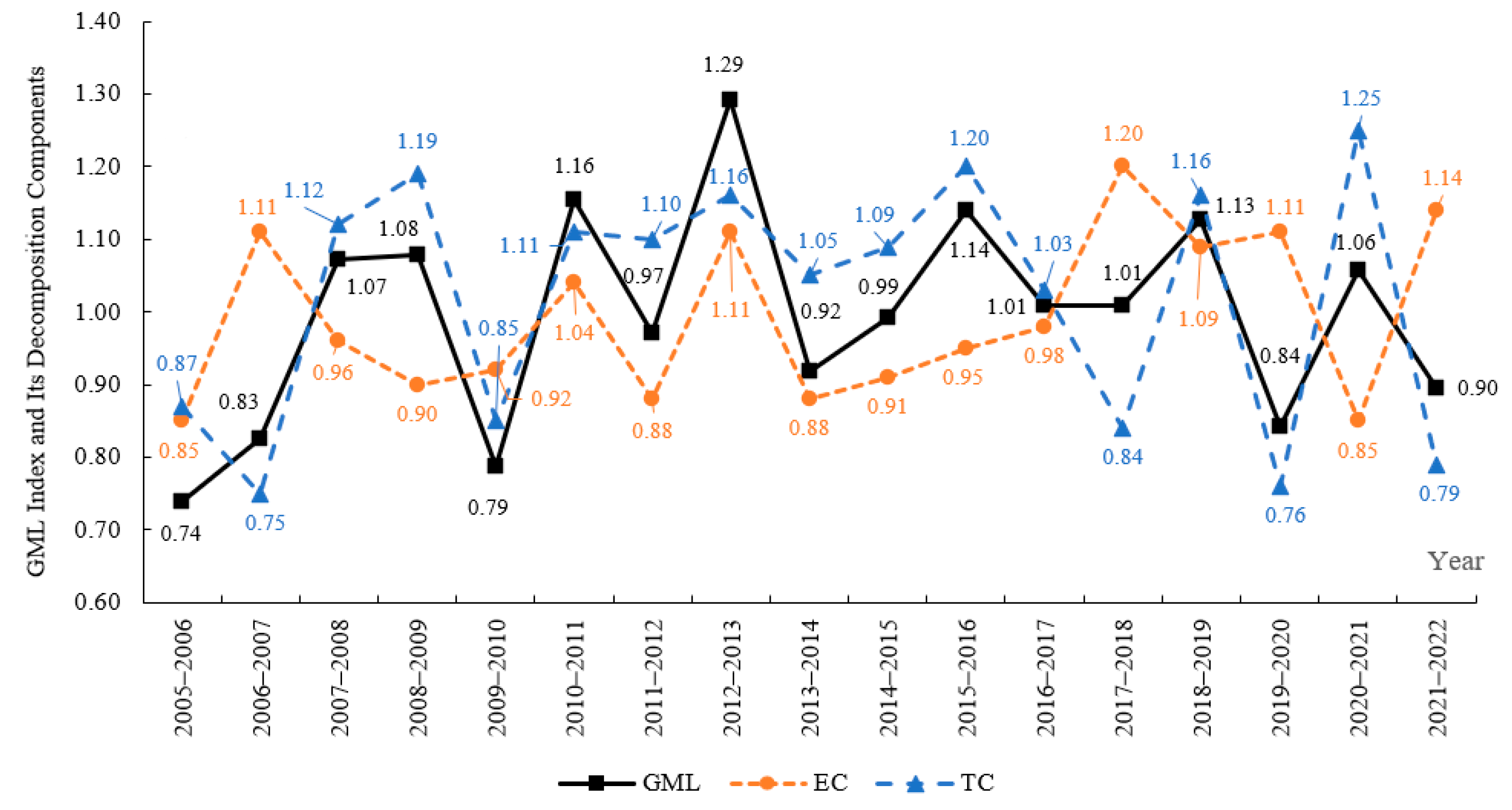 2.2.2. Global Malmquist–Luenberger (GML) Index