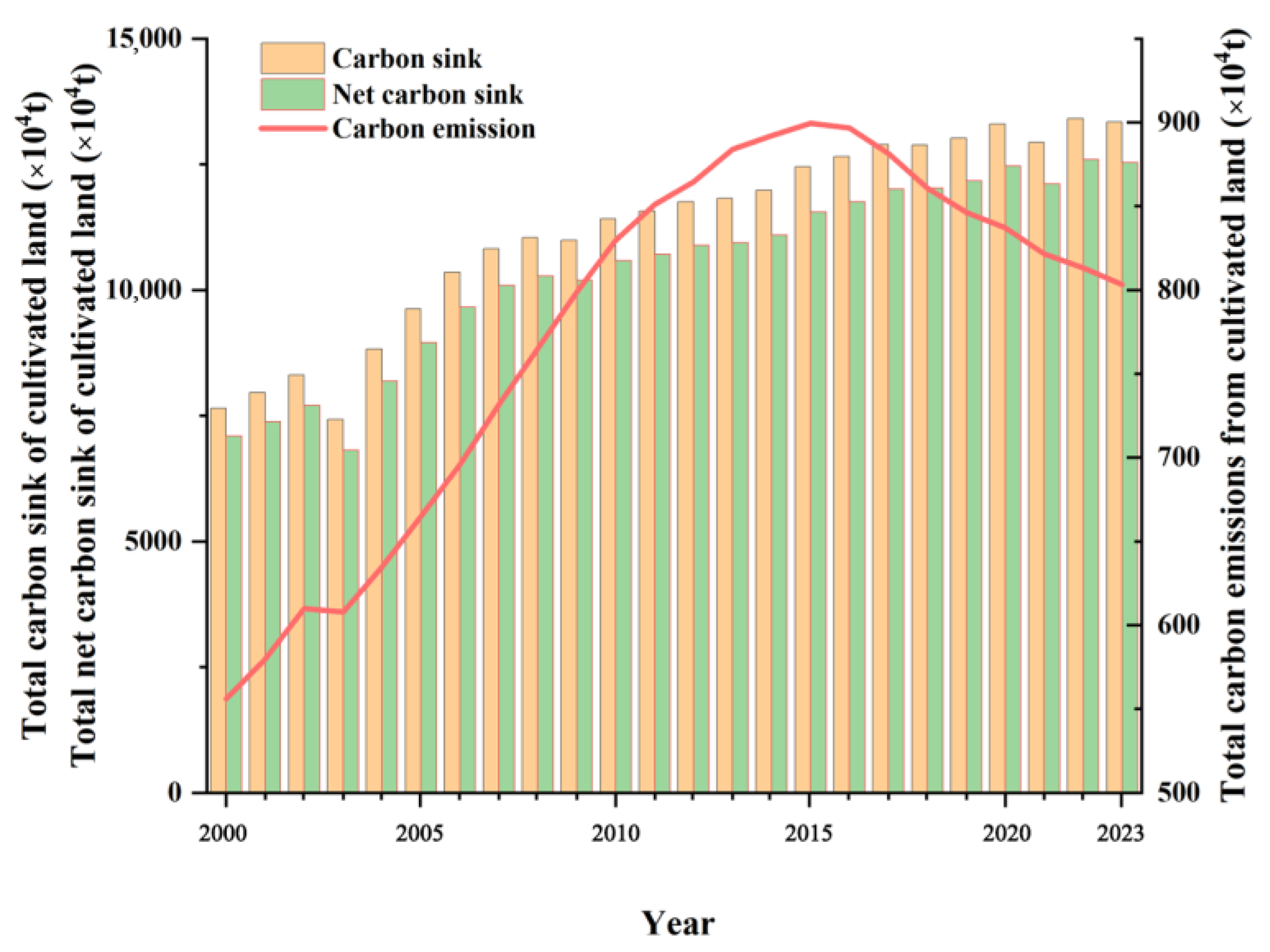 This study systematically analyzed the spatio-temporal differentiation and driving factors of the cultivated land net carbon sink in Henan Province from 2000 to 2023. The key findings include a significant increasing trend in the net carbon sink, a spatial pattern characterized by higher values in the south and east and lower values in the north and west, the dominance of wheat, maize, and vegetables as primary carbon sink contributors, and fertilizer application as the main carbon emission source. Notably, a preliminary decoupling between carbon sink growth and carbon emissions was observed after 2016. The following discussion interprets these core findings in the context of existing literature.