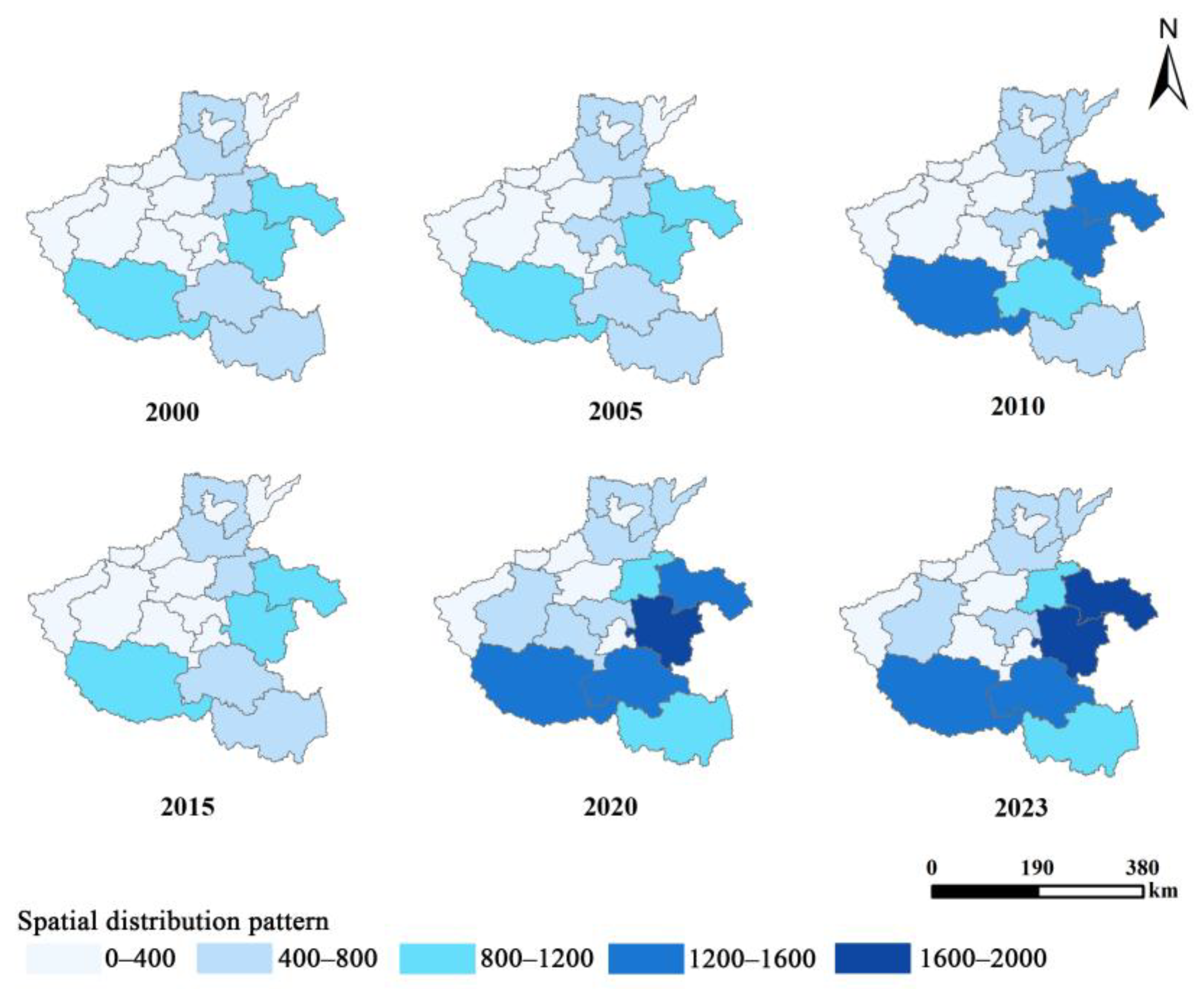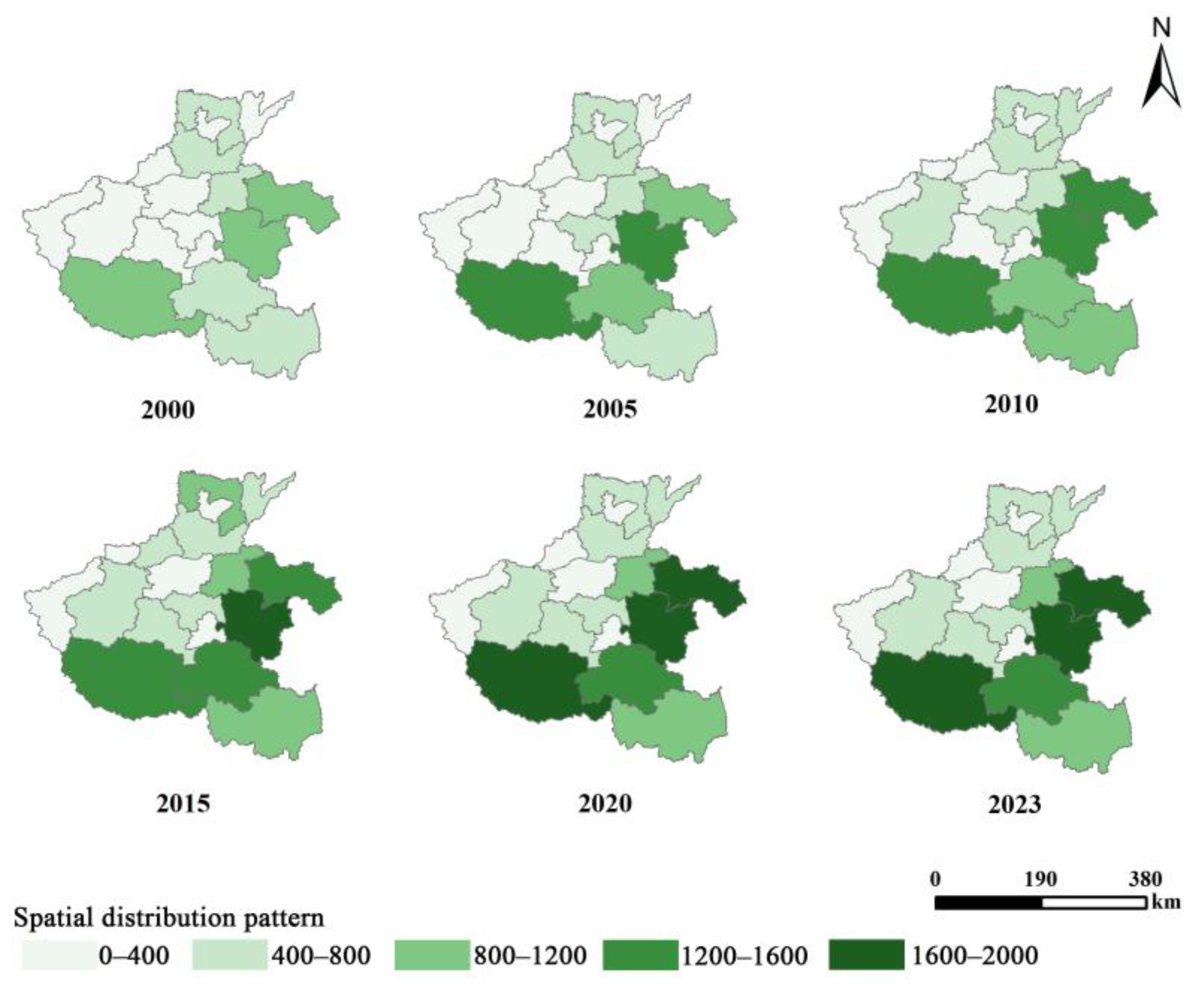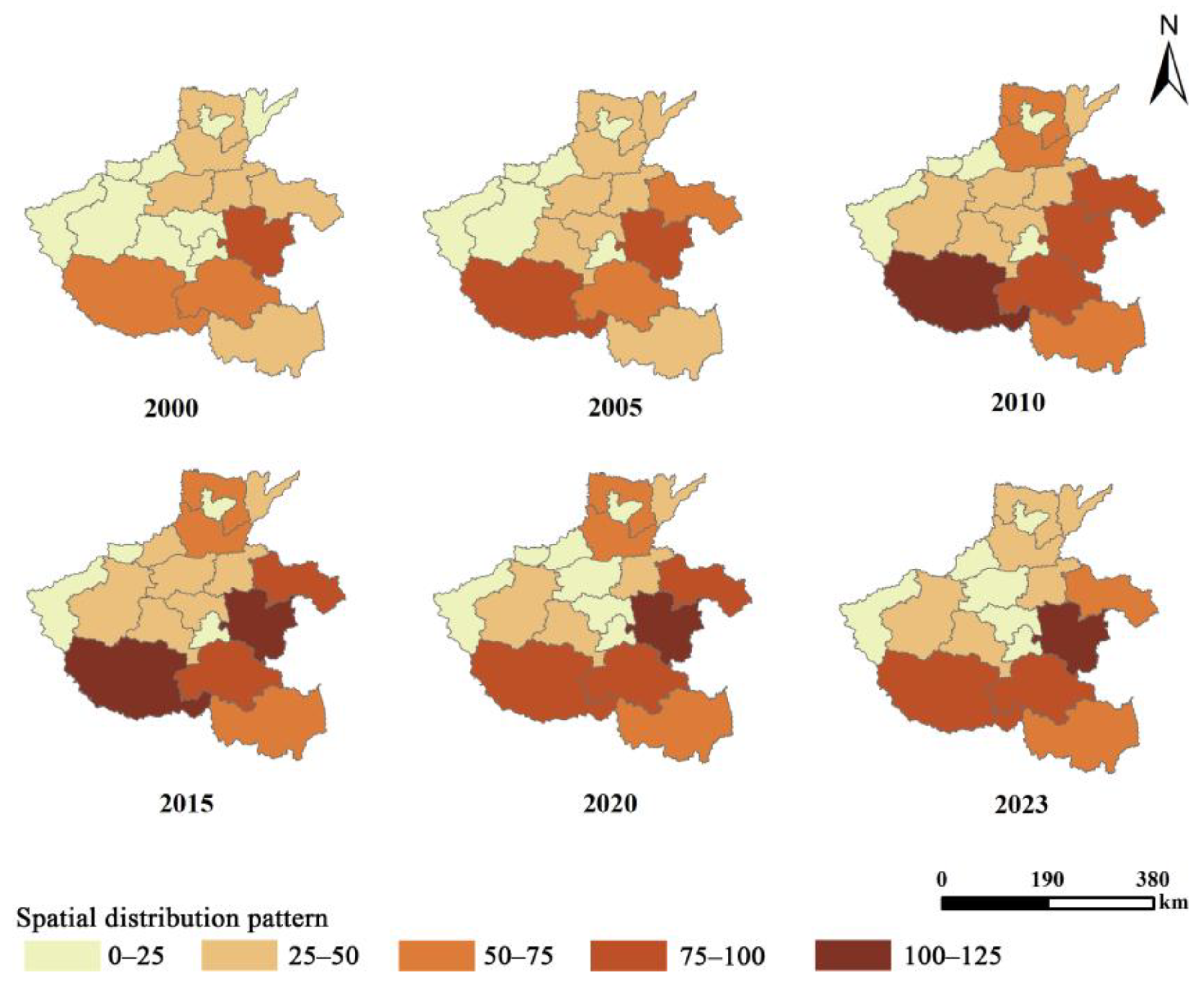 The observed spatial pattern of higher values in the south and east and lower values in the north and west is consistent with descriptions of spatial heterogeneity in land use efficiency and agro-ecological functions in Henan Province found in prior research [