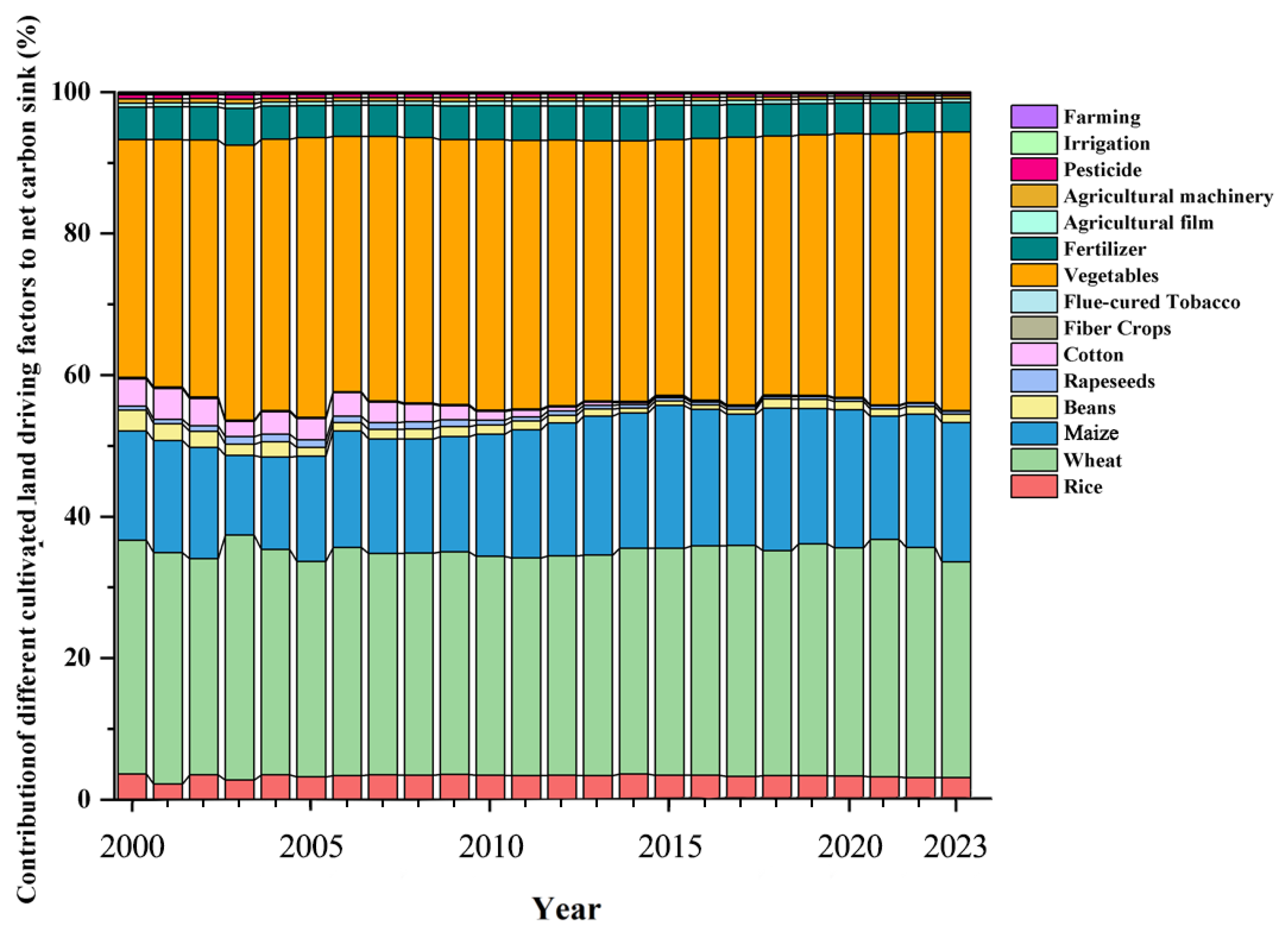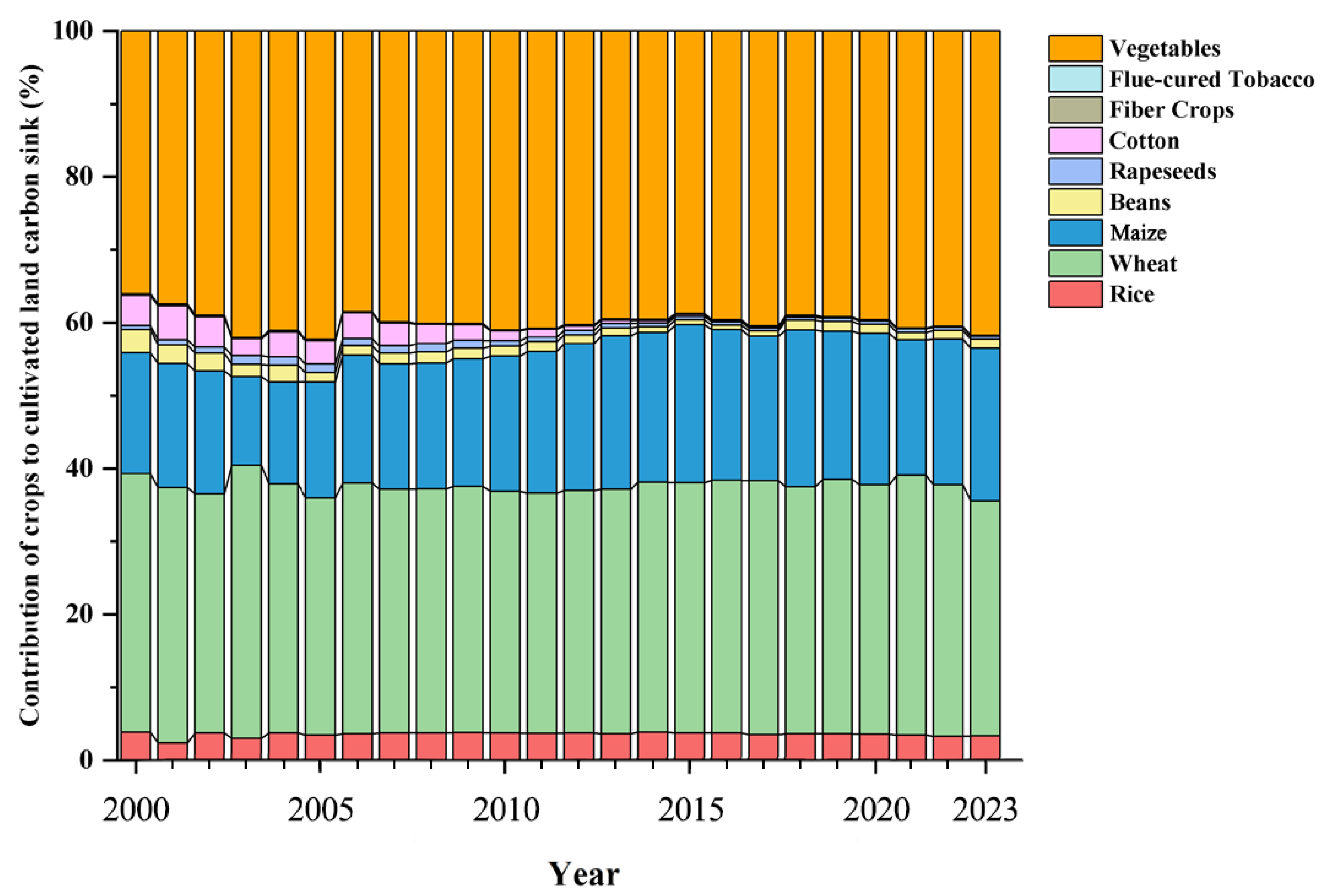 36]. However, our study further reveals that this growth was primarily fueled by three specific crops—wheat, maize, and vegetables—whose combined contribution rose from 82.12% in 2000 to 89.53% in 2023. This highlights the critical role of crop structure adjustment in regional carbon sink enhancement, providing a more granular understanding than studies focusing solely on aggregate sink values.