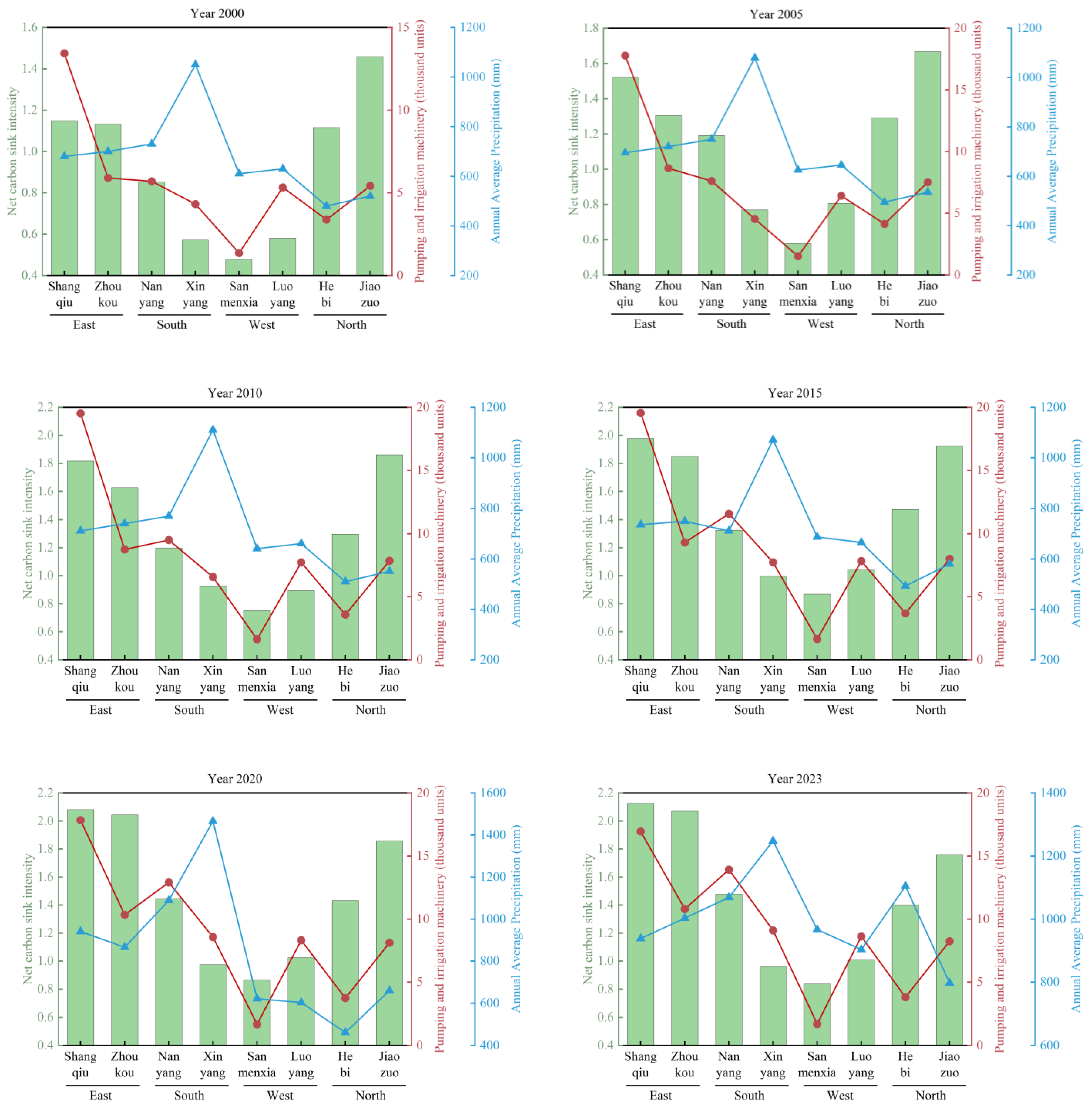 The observed spatial disparity in net carbon sinks, characterized by higher values in the south and east and lower values in the north and west, is mechanistically driven by distinct combinations of agro-climatic and managerial factors rather than being merely descriptive. The correlation analysis reinforces this interpretation, revealing a significant positive relationship between net carbon sink intensity and the density of agricultural drainage and irrigation machinery, alongside a non-significant weak negative correlation with mean annual precipitation. This quantifies the divergent pathways underlying the regional patterns. The superior net carbon sink in southern Henan, exemplified by Nanyang, Xinyang, and Zhumadian, primarily stems from a superior hydrothermal endowment. High precipitation exceeding 1000 mm in cities like Xinyang, coupled with higher accumulated temperatures, facilitates longer growing seasons and supports high-yielding multi-cropping systems such as rice paddies, thereby enhancing biomass production and carbon fixation. In contrast, the high net carbon sink in the eastern plains, exemplified by Zhoukou and Shangqiu, is forged through intensive irrigation-supported cultivation on optimal topography. While precipitation here is moderate, it is supplemented by the most extensive irrigation infrastructure in the province, enabling stable water supply for large-scale double-cropping systems of wheat and maize. This creates a powerful carbon sink engine driven by maximized sown area, the factor with the highest positive elasticity in our model. However, this very intensity also makes it the epicenter of carbon emissions, primarily from fertilizer application, resulting in a net balance that is the product of strong countervailing fluxes. The lower values in the western and northern regions are constrained by inherent biophysical limitations such as fragmented topography and poorer soil quality, reflected in the lowest provincial density of irrigation machinery, which restricts both crop productivity and the scale of high-input agriculture. This spatial heterogeneity underscores that effective strategies must be tailored to local contexts, as standardized approaches ignoring regional specificities are likely to be ineffective.