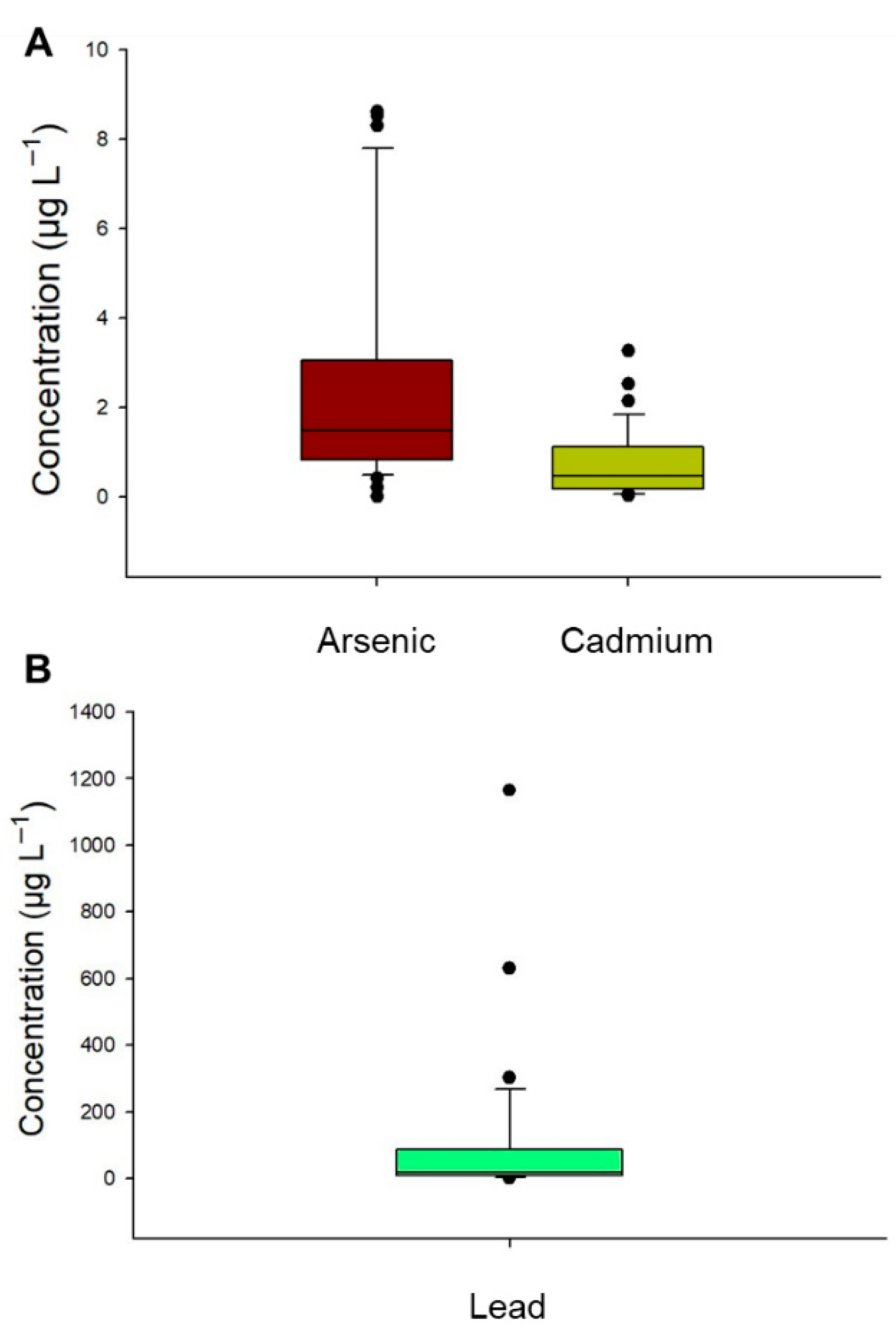 | Lead (µg L−1) | Arsenic (µg L−1) | Cadmium (µg L−1) | |||