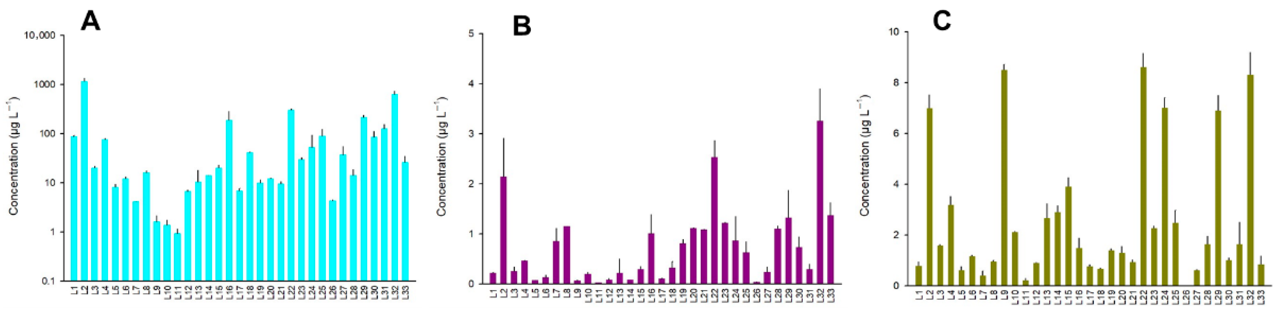 - United States Environmental Protection Agency (US-EPA). 200.8: Determination of Trace Elements in Waters and Wastes by Inductively Coupled Plasma—Mass Spectrometry; United States Environmental Protection Agency: Washington, DC, USA, 1994.