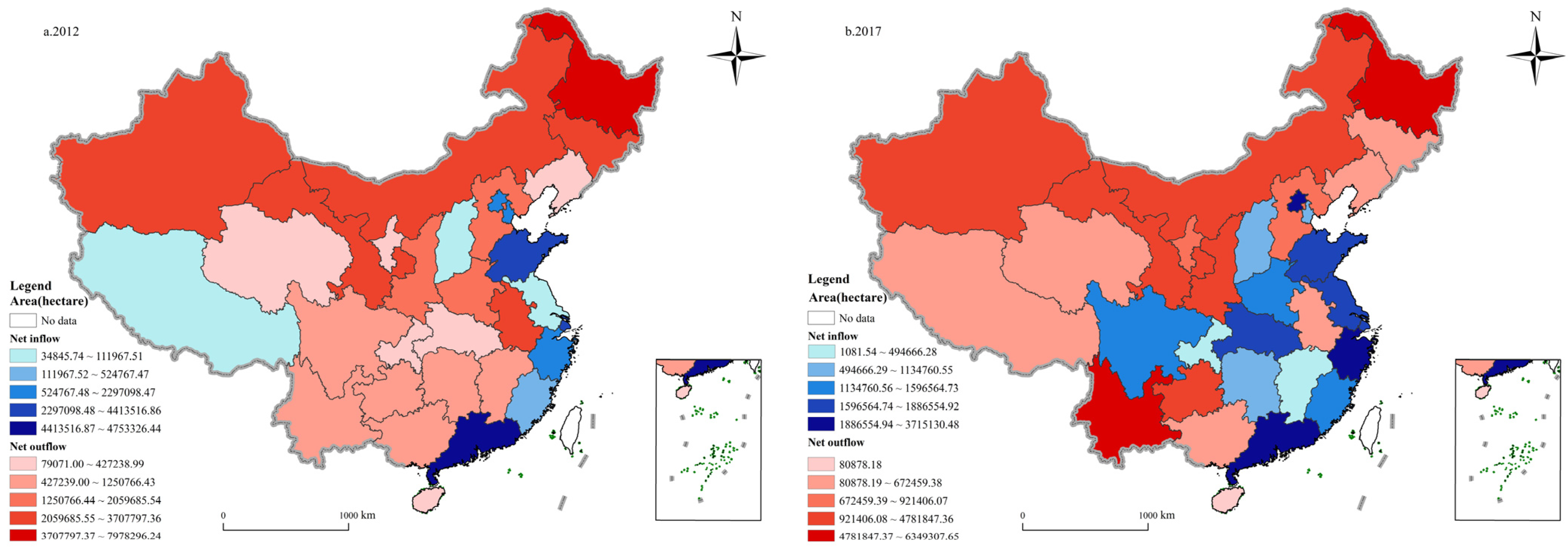 4.1. Analysis of Inter-Regional Virtual Cultivated Land Trade