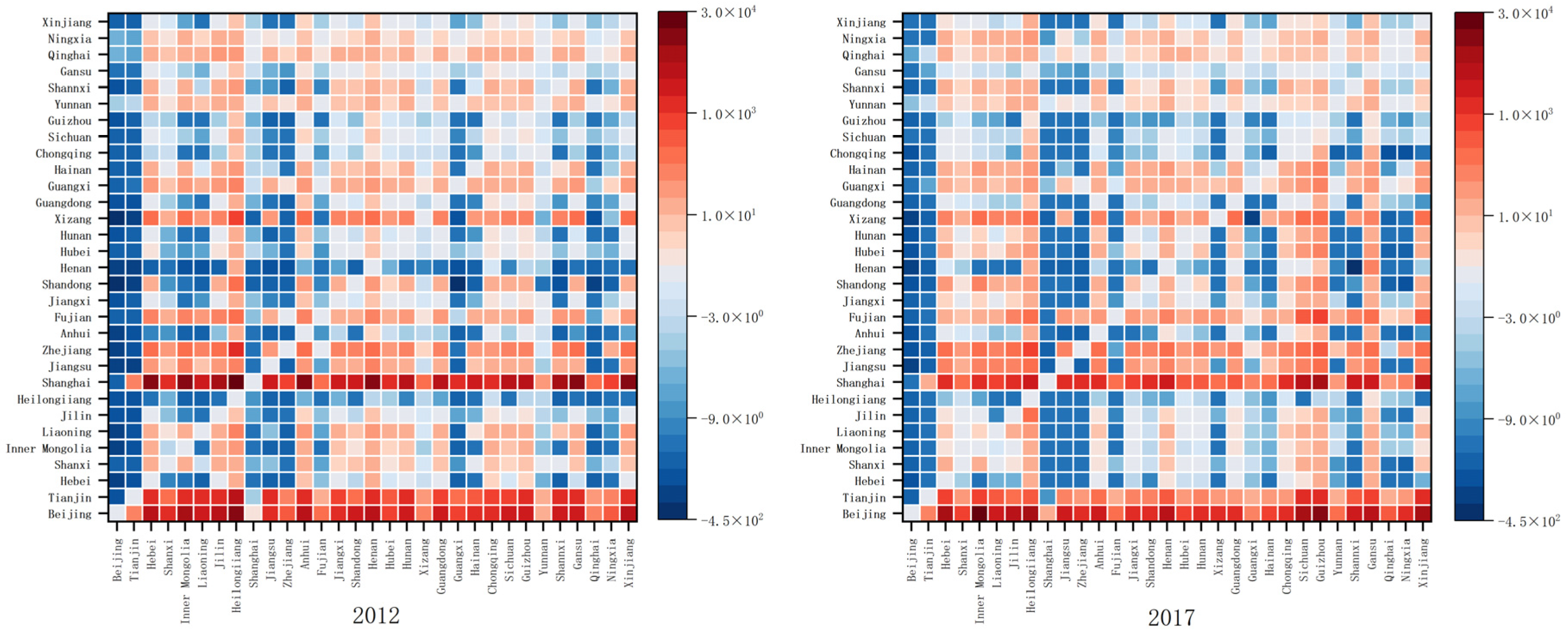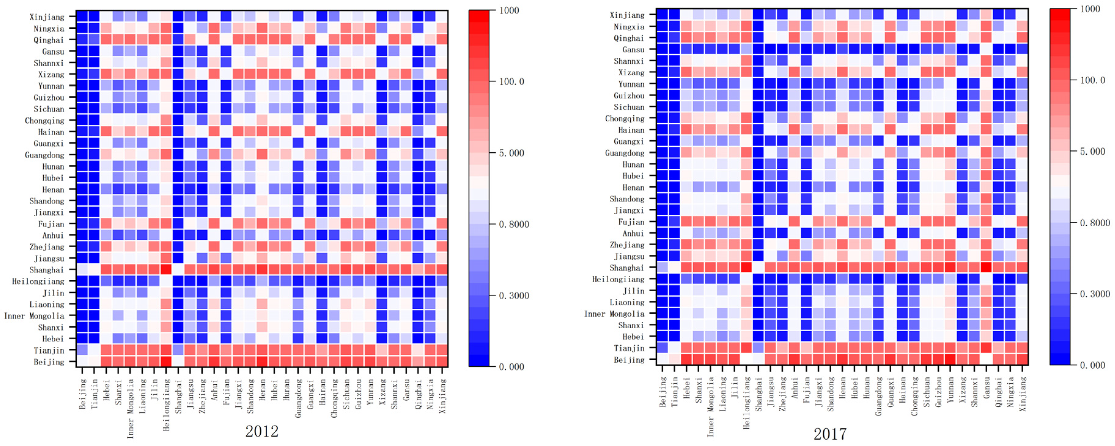 4.2. Analysis of Inter-Regional Virtual Cultivated Land Risk Transfer