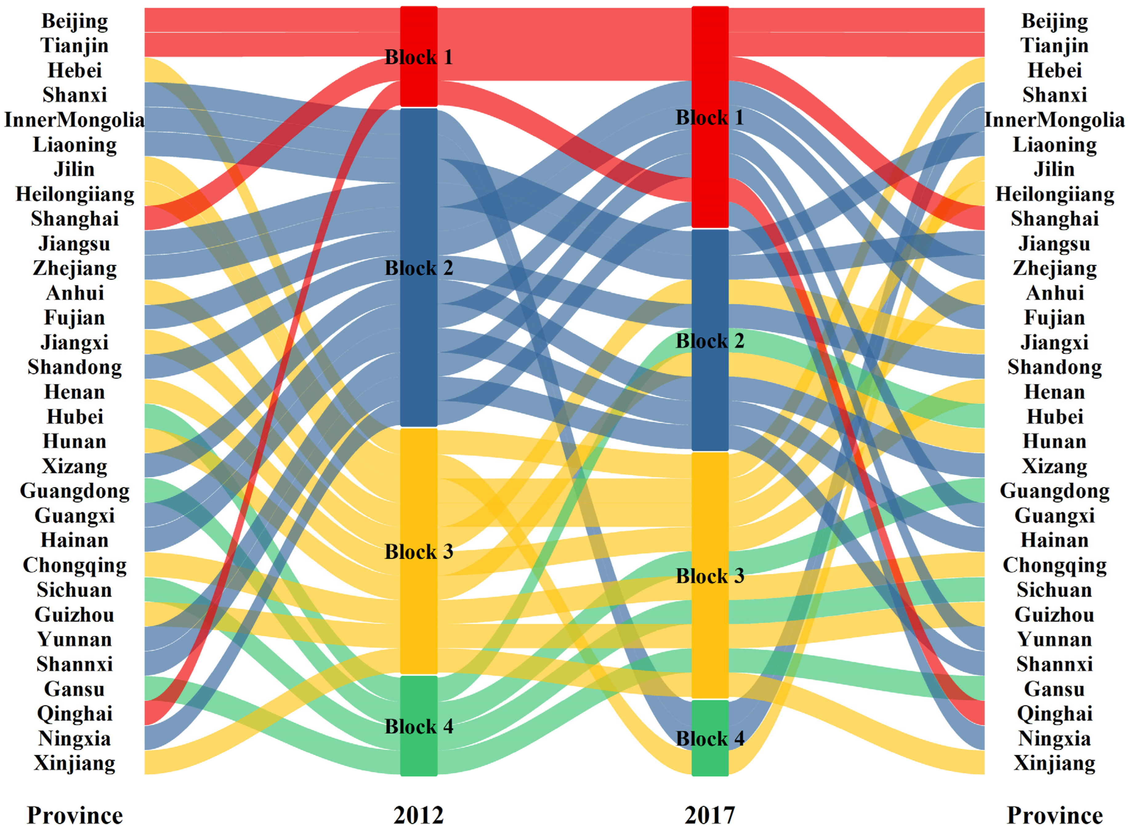 - Although the overall pattern of the risk value matrix has only minor changes, it is evident that the value of more inter-provincial trade has decreased. The pattern of inter-provincial risk transfer occurs from the majority of less developed provinces to the minority of economically developed provinces, which further underscores the inequality of the responsibility of food security. While the virtual cultivated land risk transfer network maintained a strongly connected structure, notable changes were identified in its spatial organization. The rise in in-degree centralization and average distance, along with the decline in out-degree centralization, indicate that pressures and risks have become more evenly shared; a smaller group of developed provinces continue to absorb disproportionate levels of risk value, intensifying spatial inequality. Block model analysis divided 31 provinces into a net recipient block, net sender block, broker block and major net recipient block. From 2012 to 2017, the proportion of net recipient blocks increased significantly, indicating a worrying trend. The members of different blocks varied during the studied period, but overall, major grain-production regions bear more risks and economically developed provinces are the net recipients.
