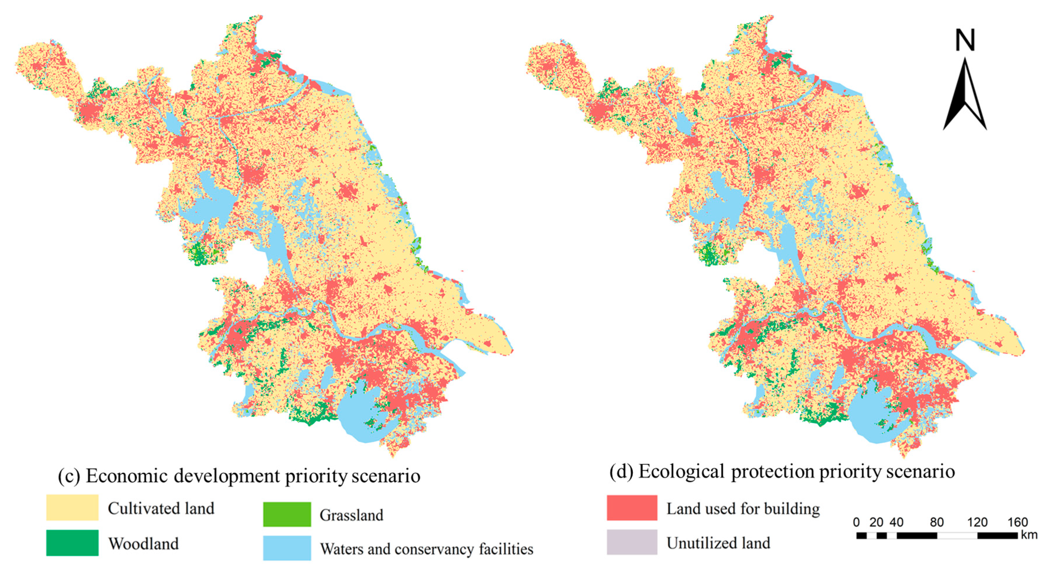 | Different Scenarios | Cultivated Land | Woodland | Grassland | Waters and Conservancy Facilities | Land Used for Buildings | Unutilized Land |