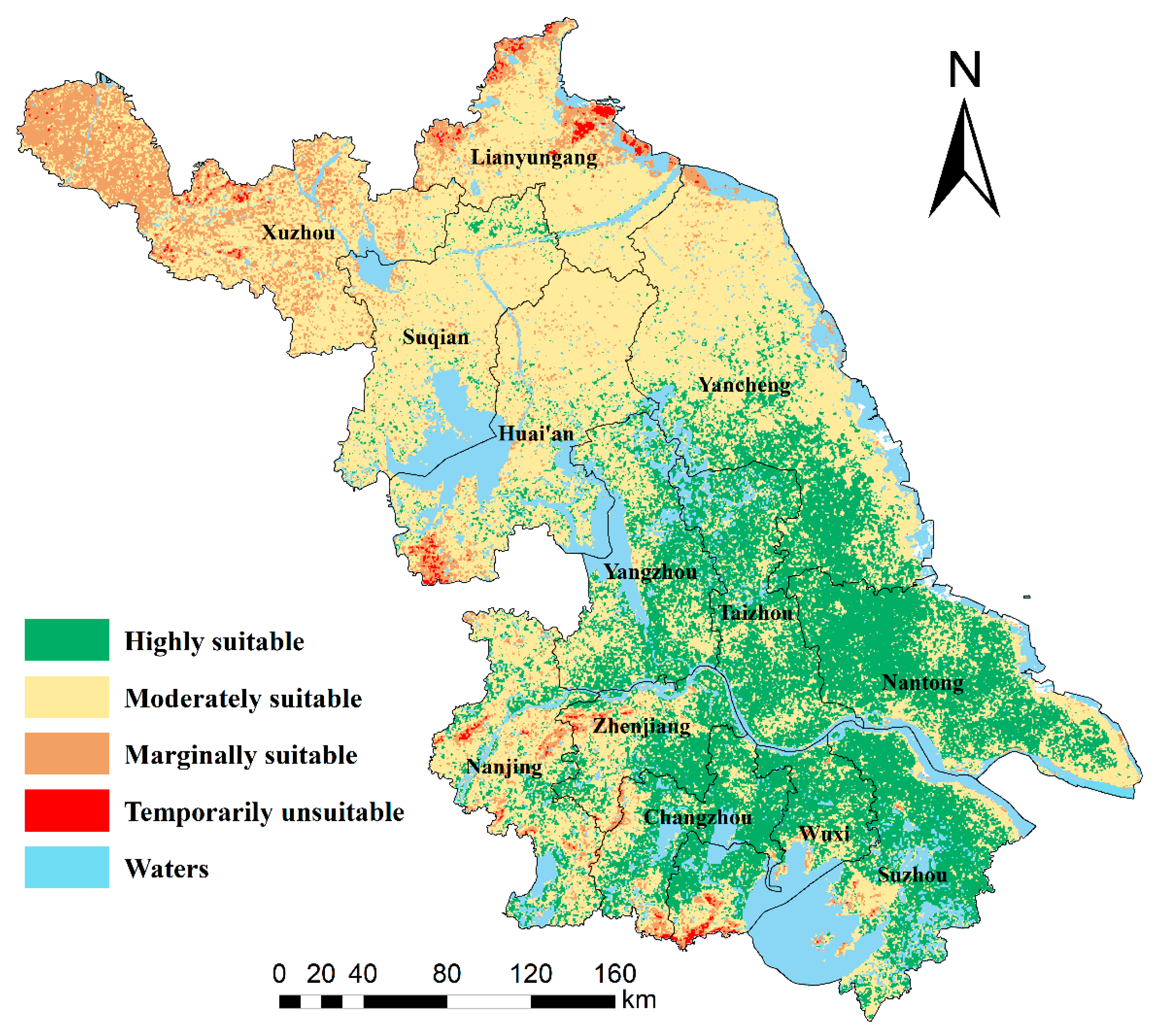 | Transfer-in plots only in the inertial development scenario and the cultivated land protection scenario | 165.74 | 6 | Moderately suitable areas are mainly distributed in the northern and central parts of Jiangsu, and a small amount distributed in the southern part of, with the limiting factors including precipitation and soil organic matter content; marginally suitable areas are mainly distributed in the northern part of Jiangsu, with the limiting factors including precipitation and soil organic matter content. | ||