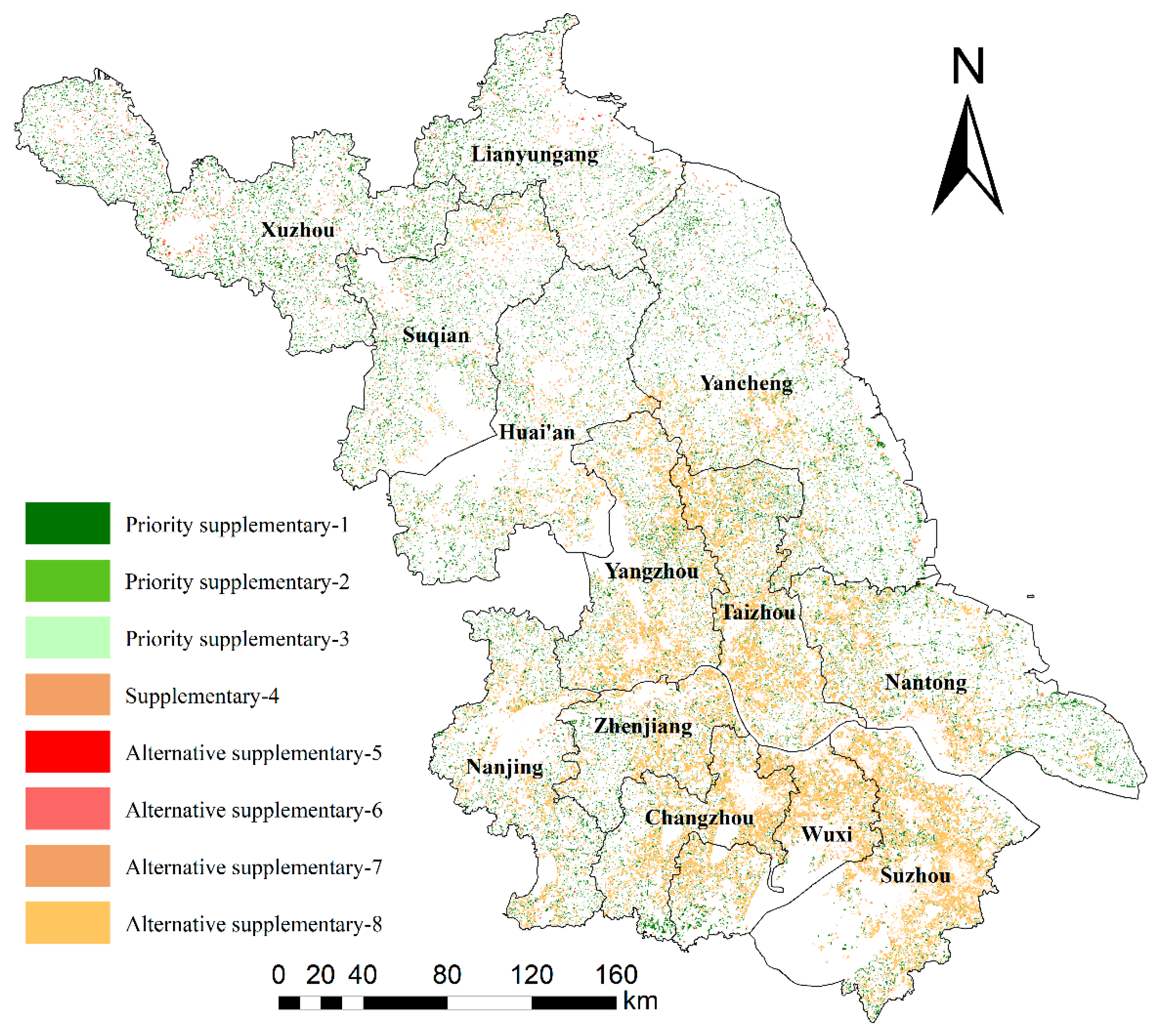 | Priority supplementary cultivated land plots | Transfer-in plots in the all four scenarios | 5219.24 | 1 | Highly suitable areas are distributed throughout the province, with few limiting factors; moderately suitable areas are scattered across various cities in Jiangsu, with the main limiting factors being precipitation, soil organic matter content and farming distance; marginally suitable areas are mainly distributed in northern Jiangsu and some areas in the southwest, with the main limiting factors being precipitation, slope, soil organic matter content and farming distance. | These plots are the most prioritized reserve resource for serving as supplementary cultivated land sources and should be incorporated into the reserve database for cultivated land occupation and compensation balance management in accordance with land utilization status and development trends. The soil layer of the highly suitable and moderately suitable plots needs to be protected for farming, so it can be regarded as high-quality supplementary farmland, while the marginally suitable plots can adopt certain improvement measures to enhance the land quality. |