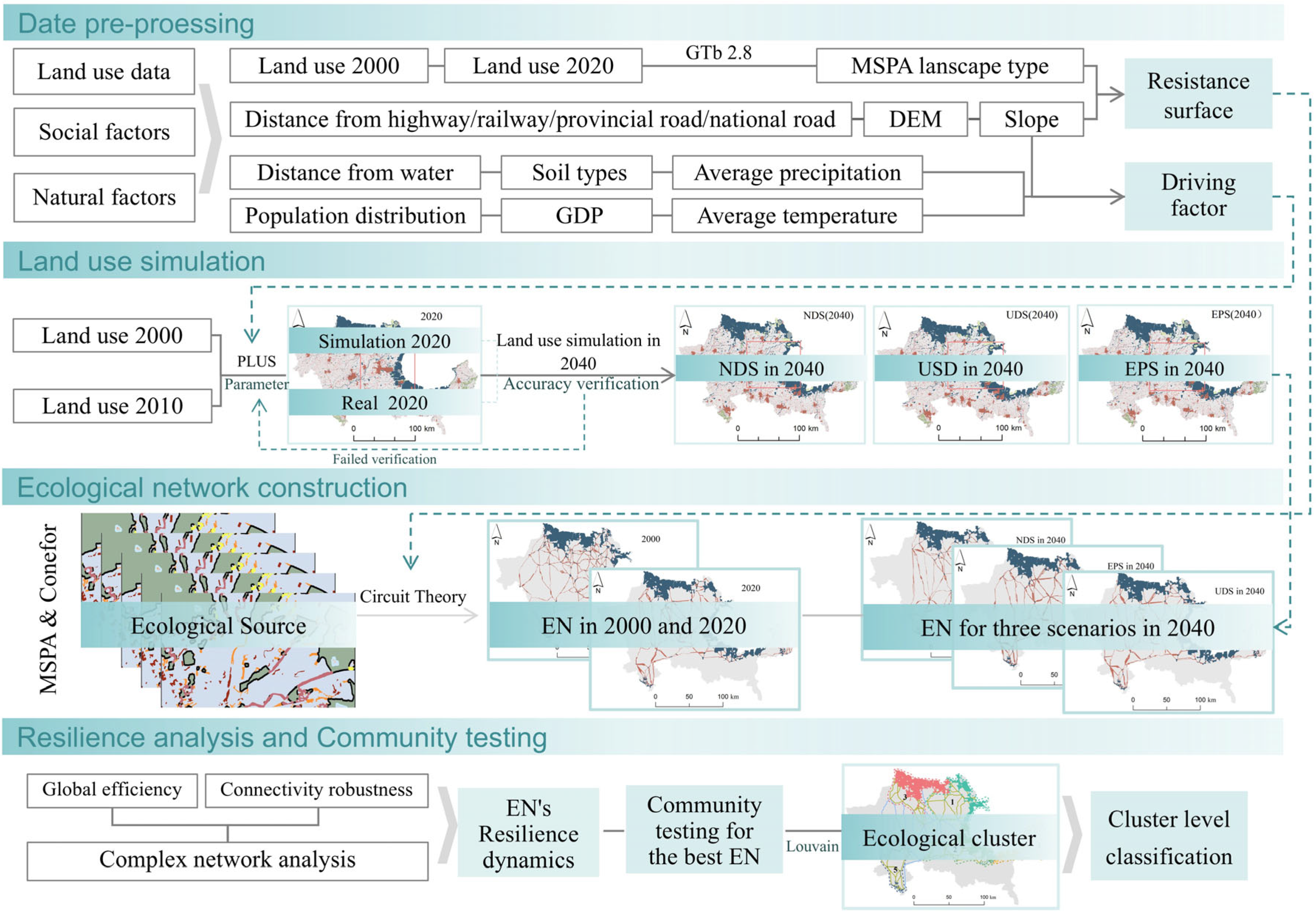 This section begins with the use of the PLUS model to simulate land use patterns based on corrected land use data and multiple driving factors. Subsequently, three land use scenarios for the year 2040 were developed to implement the model-generated predictions. For each scenario in 2040, as well as for the years 2000 and 2020, ENs were constructed by integrating MSPA, connectivity analysis, and circuit theory. Finally, network robustness simulations based on complex network theory were conducted to explore the dynamic characteristics of EN resilience. Community detection was then applied to the EN under the scenario with the highest projected resilience, allowing for the identification and classification of key clusters at the community scale. The overall research framework is illustrated in Figure 2.
