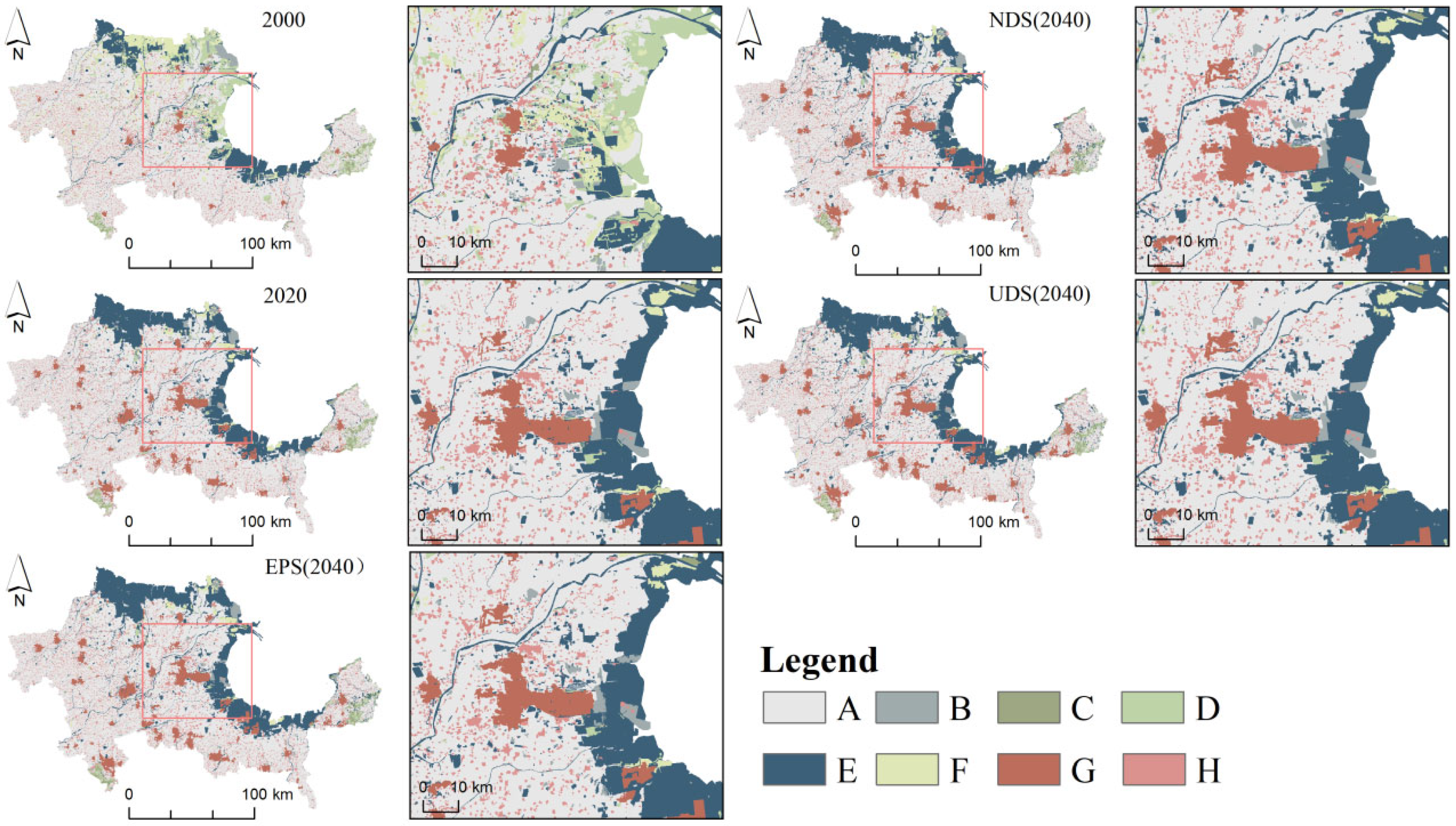 By 2040, agricultural production land in the study area is projected to show a declining trend, while urban residential land is expected to increase (Table 5). Across the different scenarios, the UDS results in the most significant expansion of urban residential land, with an increase of 358.98 km2 compared to 2020. In contrast, under the EPS, the increase is more modest, at only 212.92 km2 (Table 5). Forest, grassland, and other ecological land types all exhibit a decreasing trend in area, but the reductions are smallest under the EPS. Water ecological land is the only ecological land category to demonstrate a marked increase across all scenarios; even under the UDS, where the growth is smallest, it still increases by 392.13 km2 (Table 5).