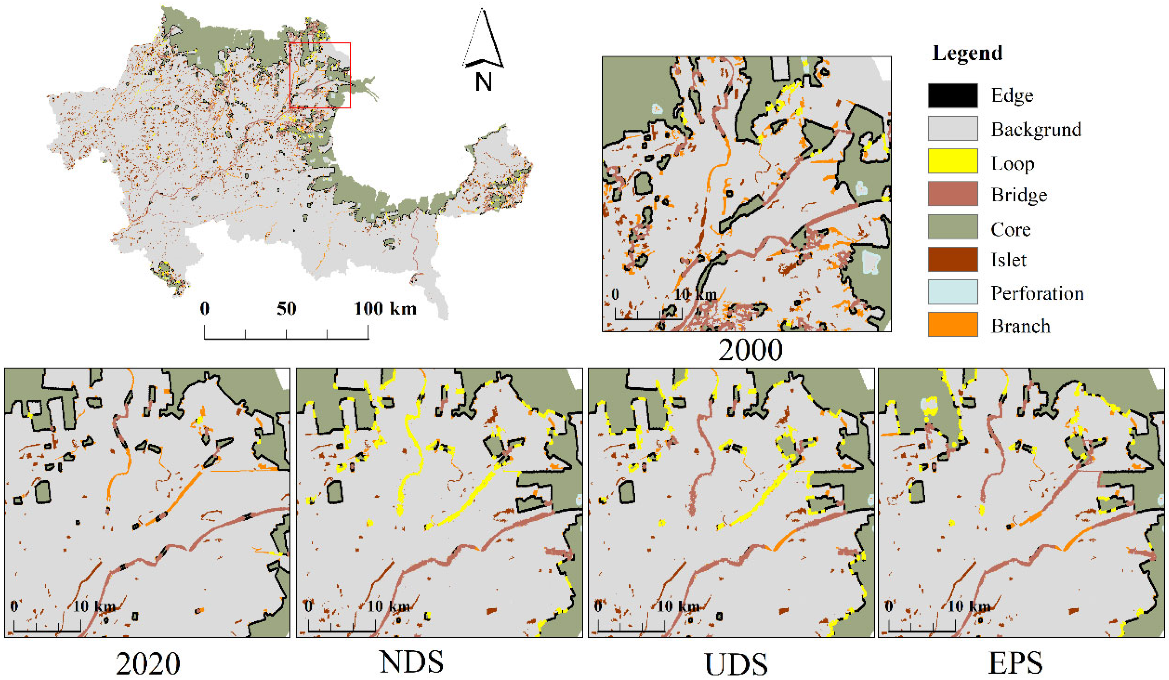 From a temporal perspective, the number and total area of ecological sources exhibited a clear declining trend between 2000 and 2020, with a reduction of 555.57 km2 in total area (Table 6). However, projections for 2040 indicate a slight increase in total area across all scenarios, although the number of ecological sources continues to decline. In terms of spatial distribution, ecological sources maintained a relatively stable spatial pattern over time. Large patches of ecological sources were consistently concentrated in the coastal areas of the study region.