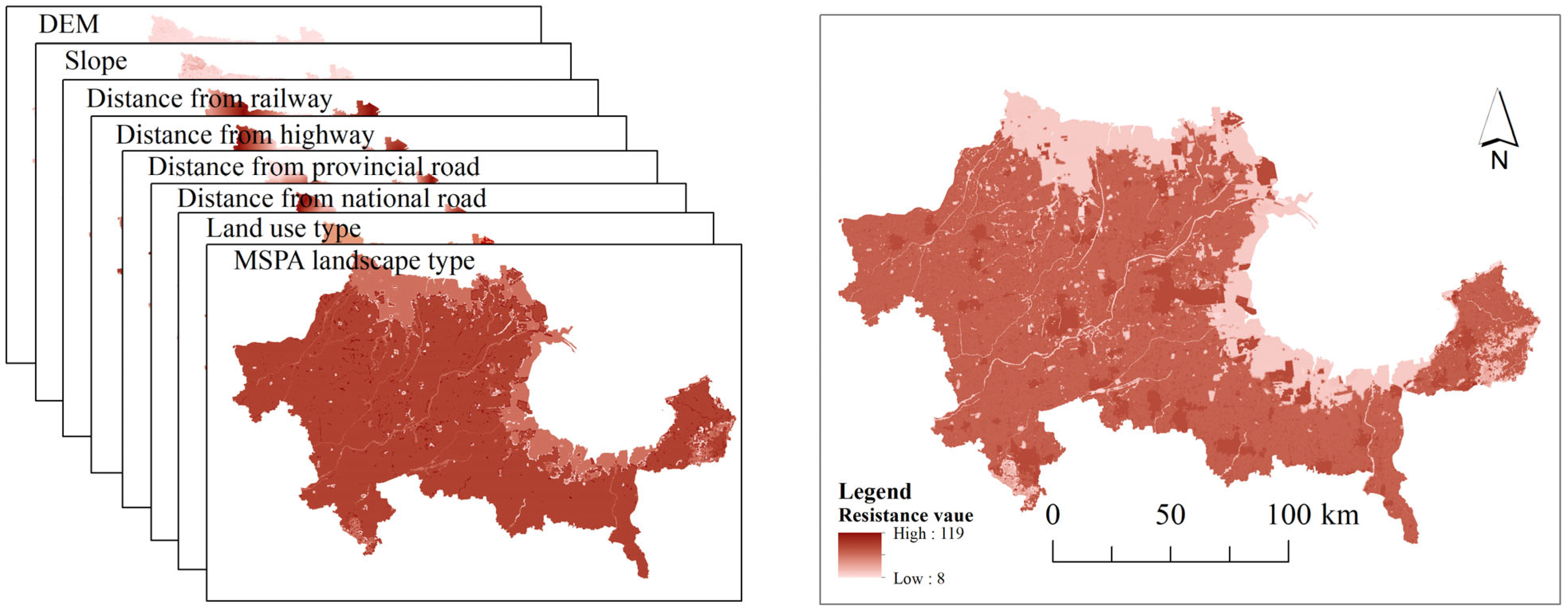 During the migration and transfer of organisms and energy between habitat patches, various environmental and anthropogenic factors may impede or interfere with these processes. The ecological resistance surface intuitively reflects the difficulty species face when moving across different landscape units, and serves as a critical foundation for constructing ecological corridors [28]. In this study, eight resistance factors were selected based on the ecological and environmental characteristics of the study area, including DEM, slope, land use type, and MSPA-derived landscape categories. The construction of the resistance surface involved three main steps. First, land use types and MSPA landscape categories were classified and assigned resistance values. These assignments were determined primarily based on existing literature and expert judgment [12,13,28]. Other resistance factors were also assigned values based on their ecological relevance and data characteristics. Specifically, DEM and slope were normalized in a positive direction, indicating that higher values correspond to greater resistance. In contrast, the distance to transportation networks was normalized in a negative direction, meaning that larger values represent lower resistance. All resistance values were rescaled to a range between 0 and 100 [3,12]. Second, all eight resistance layers were normalized to eliminate dimensional inconsistencies among different data sources. Finally, the weights of each resistance factor were determined based on the characteristics of the study area, using the expert scoring method and with reference to relevant research findings [3,12]. weighted resistance values were calculated for each factor based on their assigned resistance values and relative weights (Table 4). Through spatial overlay analysis of all single-factor resistance layers, an integrated ecological resistance surface was generated.