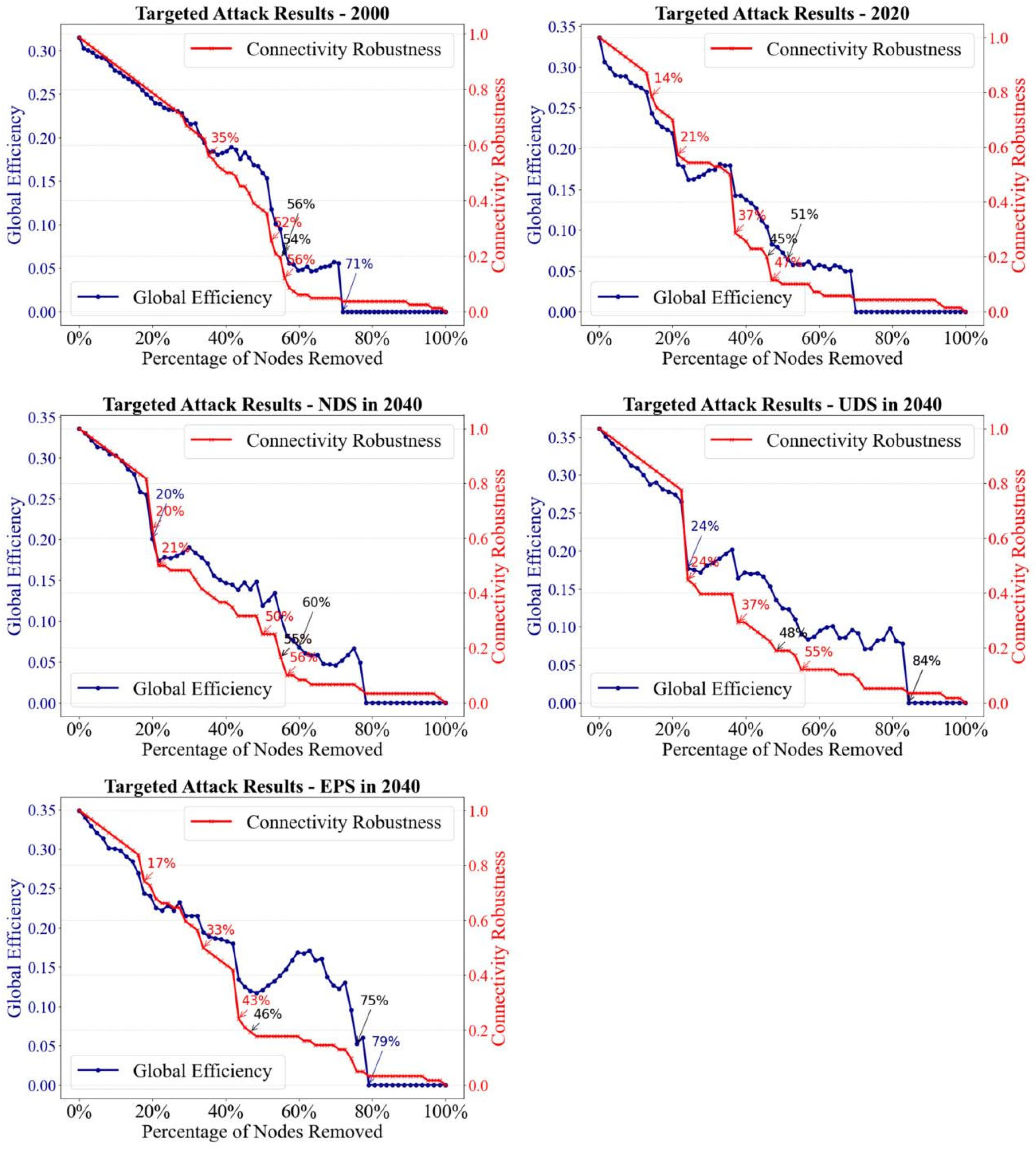 In summary, the UDS in 2040 exhibited the highest initial global efficiency and the greatest structural resilience to disturbances. Under UDS, both connectivity robustness and global efficiency remained stable until approximately 24% of nodes failed, and the thresholds for a 20% performance drop in both metrics were significantly higher than in the NDS and EPS.