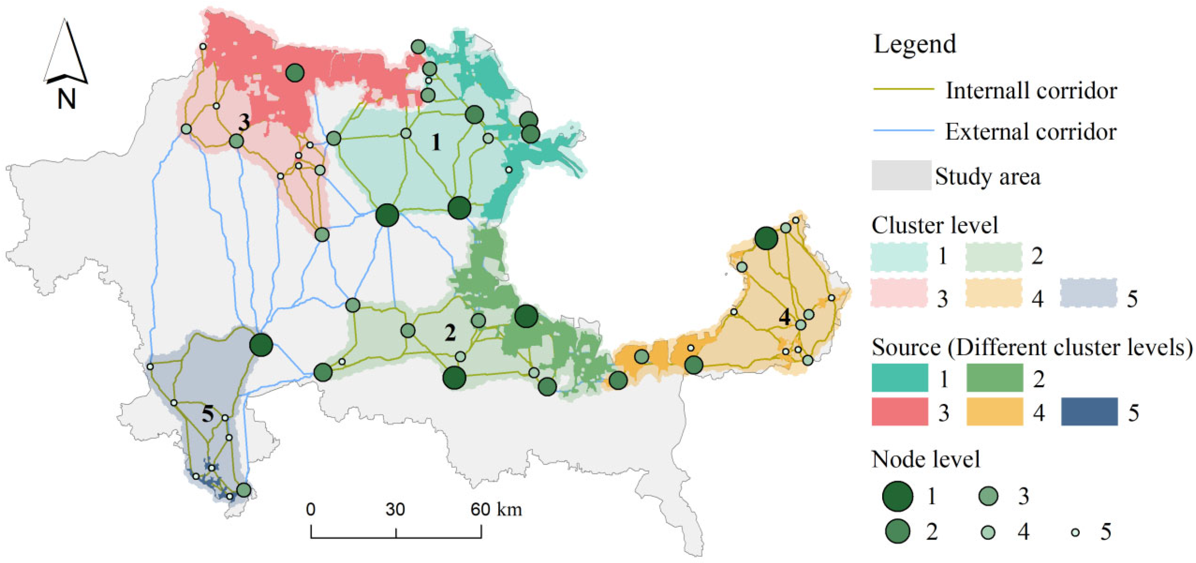 Through community detection, the EN was divided into multiple ecological clusters characterized by strong internal connectivity. To evaluate the relative importance of these clusters, a comprehensive assessment framework (Equation (6)) was developed, incorporating the following indicators: the number of nodes within each cluster, node degree centrality, eigenvector centrality, the number of inter-cluster connections, and the number of internal versus external corridors associated with each cluster. All indicators were subjected to normalization standardization, and the simple averaging method was adopted for indicator aggregation. By integrating these indicators, we ranked the ecological clusters according to their importance, enabling the precise identification of critical regions within the EN at the cluster level.