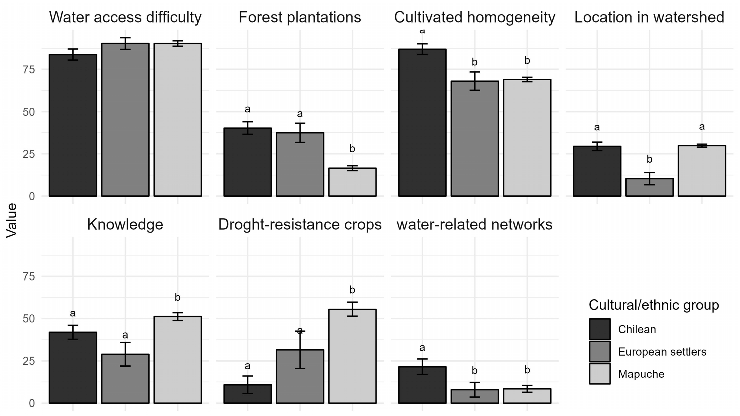 Field measurements suggest that Mapuche farmers showed lower levels of vulnerability, largely due to crop diversity levels and reduced proximity to pine plantations, which are known to reduce water reserves in micro-watersheds. European-descendant farmers exhibited greater crop diversity than criollo farmers. Mapuche farms scored high values of response capacity linked to their strong knowledge of adaptive practices and the conservation of crop species and varieties resistant to drought. However, Chilean farmers demonstrated greater involvement in social networks that control access to irrigation water (