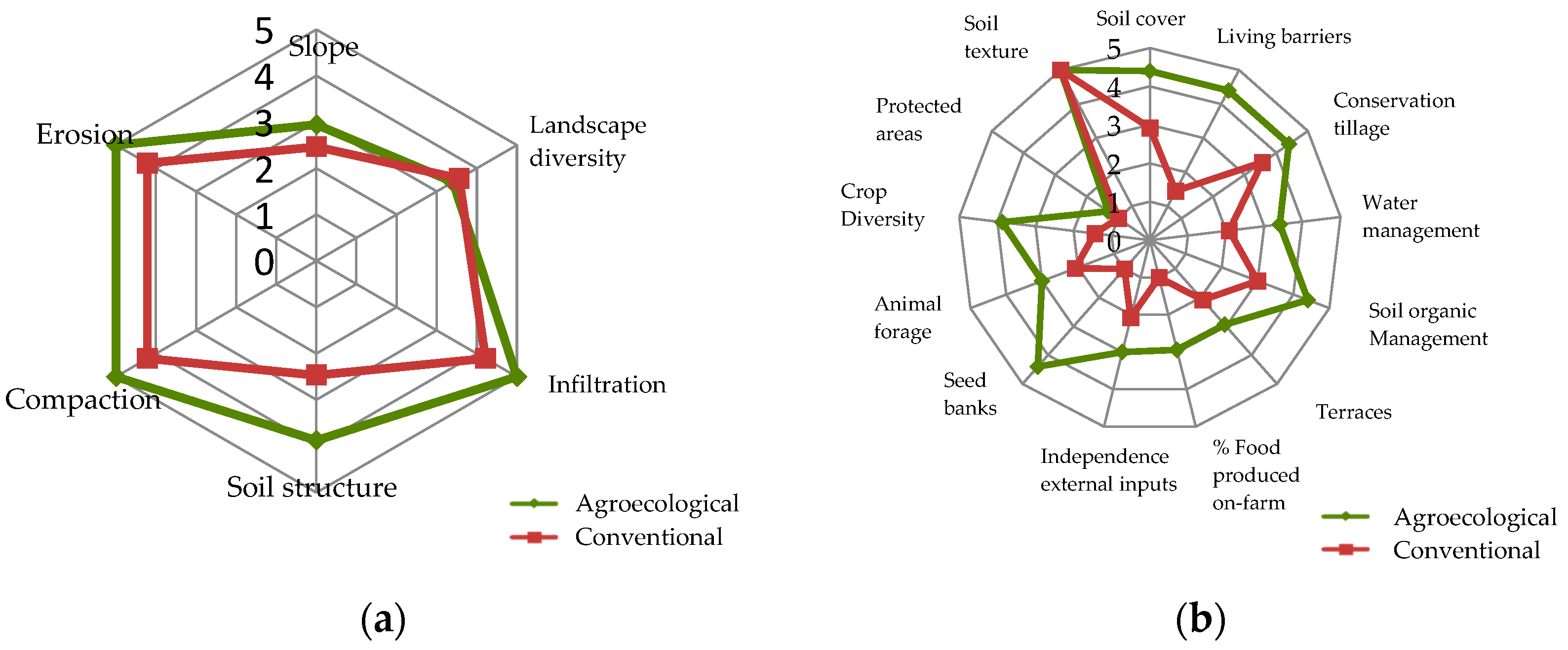35]. Six indicators were chosen to evaluate vulnerability, such as slope, landscape diversity, and soil erosion susceptibility, while thirteen indicators were used to assess response capacity, including crop diversity, soil conservation, levels of food self-sufficiency, and others. The indicators were scored on a scale from one to five; values of one or two indicated high vulnerability, while values of four or five reflected a strong response capacity. This scoring system allowed to determine the vulnerability and response capacity of each farm, as well as comparing their performance with one another. According to the values given to the indicators, the agroecological farms (green) exhibited, on average, low vulnerability and high response capacity in relation to the conventional farms, which expressed high vulnerability and low response capacity (red) (