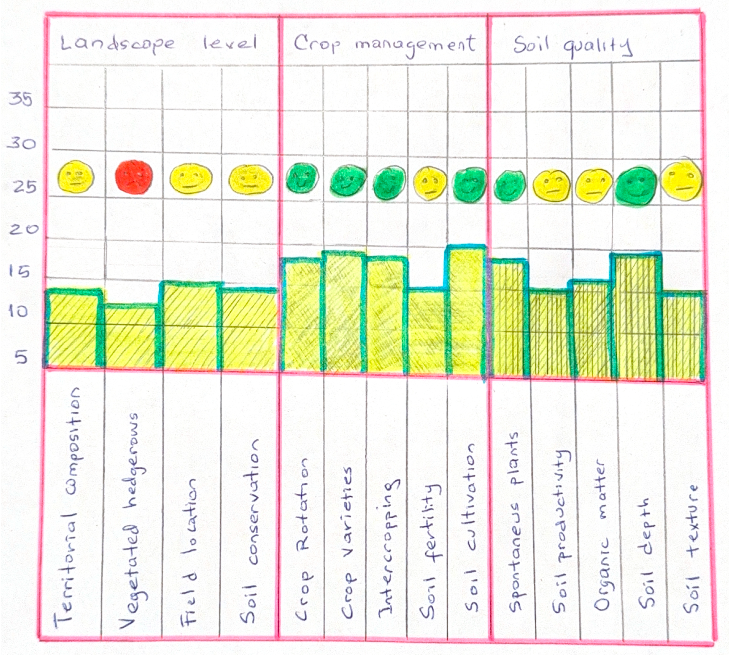 36]. A total of 14 indicators were identified by farmers to assess the adaptive capacity of farms. These included four landscape-level indicators—territorial composition, the presence of windbreaks, field location, and soil conservation practices—as well as several management-related indicators, such as crop genetic diversity, use of crop rotations, polycultures, and soil practices. The six soil quality indicators included the presence of spontaneous non-crop vegetation, soil organic matter content, as well as soil texture and depth. Farmers evaluated each indicator using a visual scale of happy (score 5), neutral (scores 3–4), and sad (scores 1–2) faces to denote optimal, acceptable, and marginal conditions, respectively.