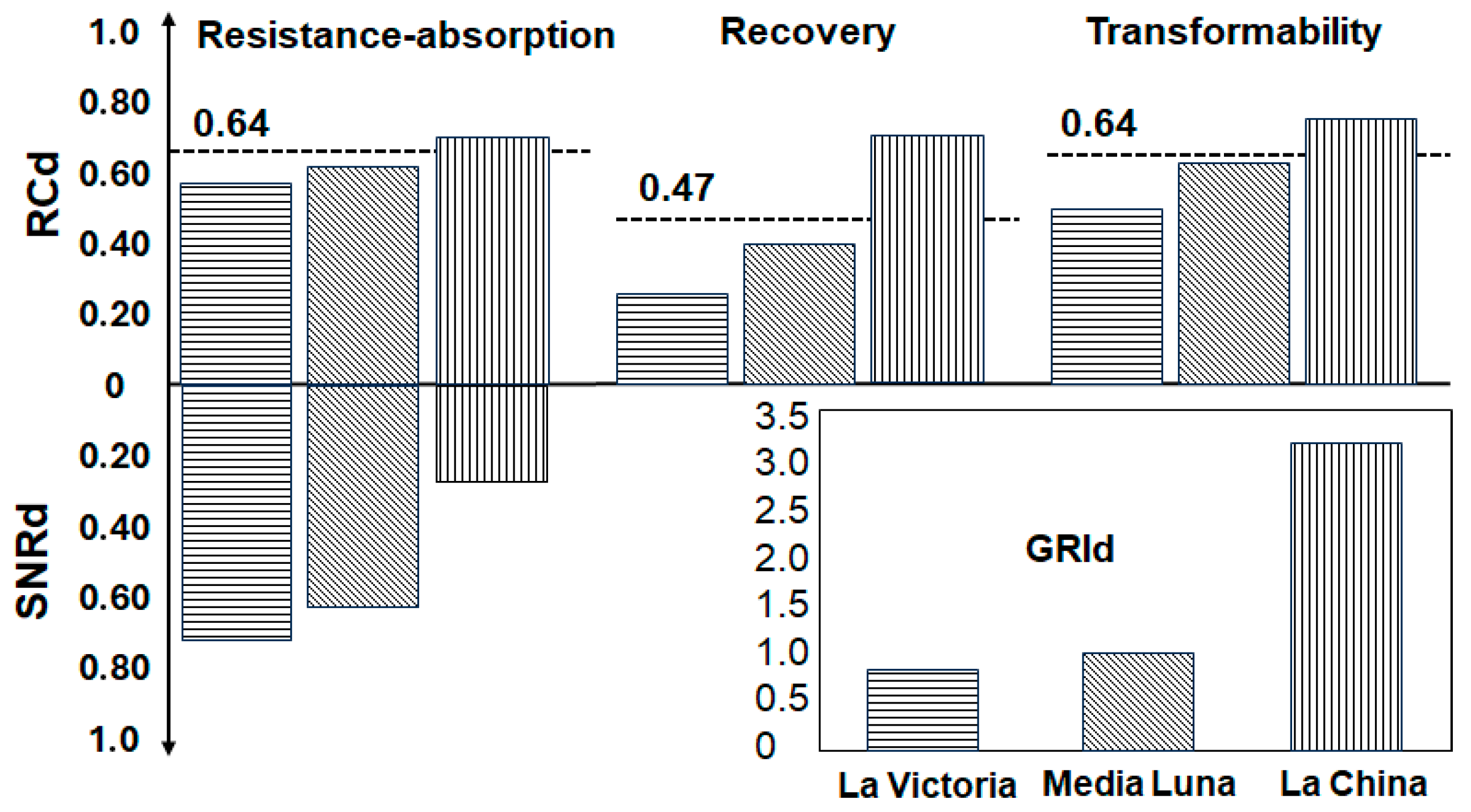 The General Resilience Index to Drought (GRId) was calculated using the formula GRId = RCd/SNRd. Of the farms evaluated, La Victoria demonstrated the lowest capacity for drought resilience (GRId = 0.66). Media Luna presented a moderate level of resilience (GRId = 0.93), whereas La China reached a high GRId value (3.21), indicating strong resilience capabilities. The fact that three farms surpassed the drought resilience threshold (GRId > 0.5) indicates that the process of agroecological transition builds farm resilience over time. Across the three farms, drought resilience capacity (RCd) was inversely related to the sensitivity of key productive natural resources, including crops, livestock, soil, and water availability. The findings indicate that resource sensitivity decreases as resilience capacity increases (