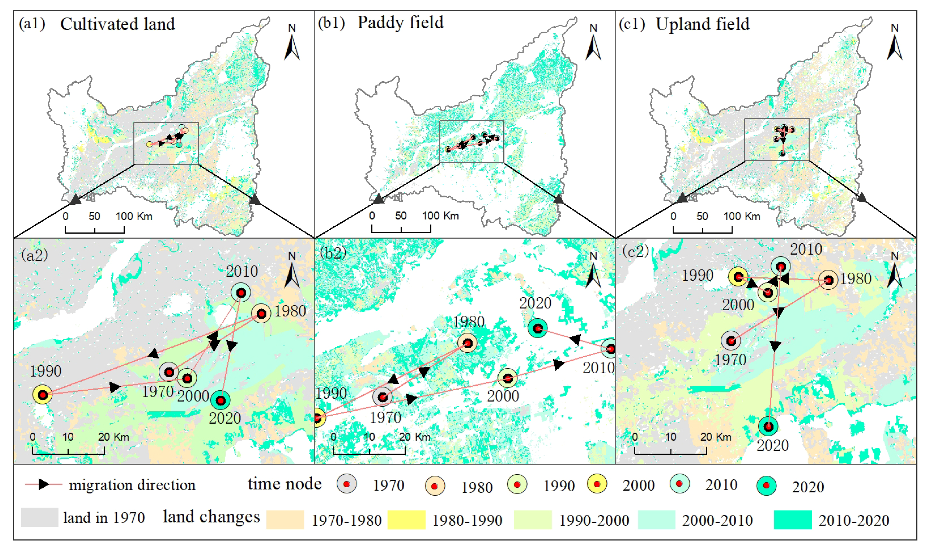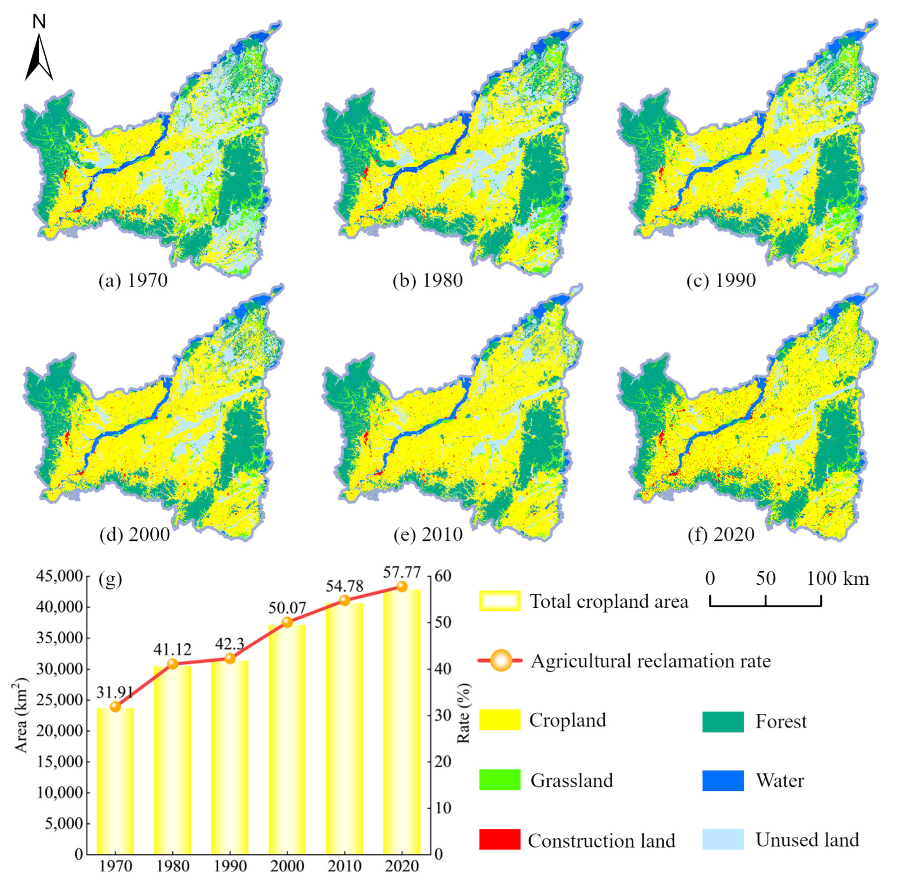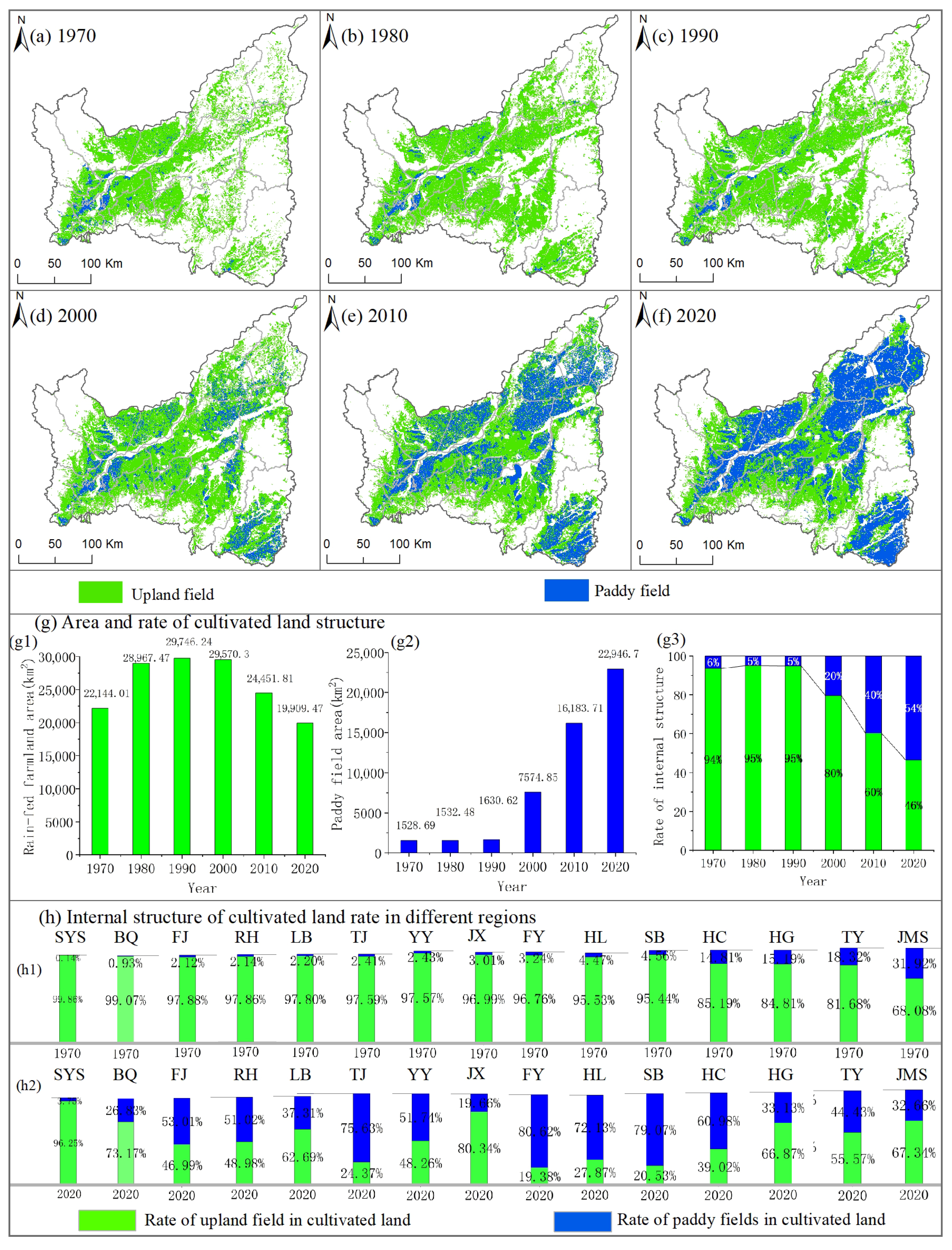 3.2. Cropland Structure Migration Process with 10-Year Intervals in the Study Area from 1970 to 2020
