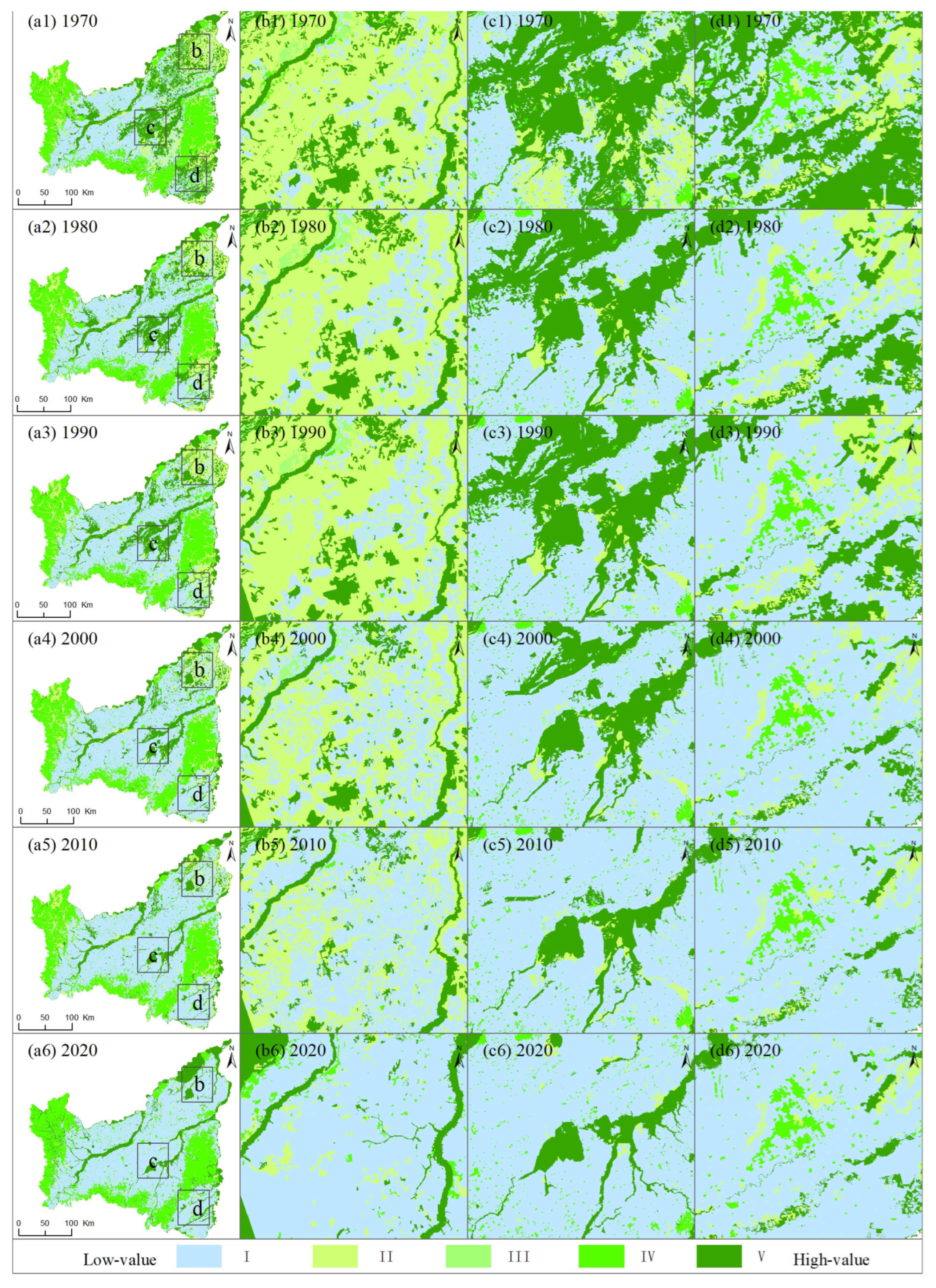 - Jin, S.; Liu, X.; Yang, J.; Lv, J.; Gu, Y.; Yan, J.; Yuan, R.; Shi, Y. Spatial-temporal changes of land use/cover change and habitat quality in Sanjiang plain from 1985 to 2017. Front. Environ. Sci. 2022, 10, 1032584. [Google Scholar] [CrossRef]