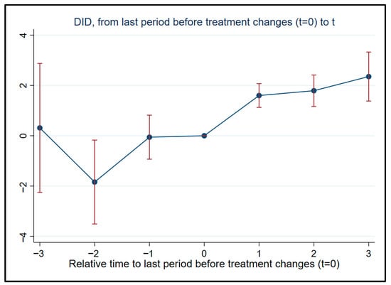 Before using the DID model to estimate policy effectiveness, we have to conduct a parallel trend test on the treatment group and the control group to verify that the dependent variables of the two groups have the same trend before the policy events impact. Based on the principle of event study methodology and referencing the commonly used pre-event parallel trend test equation adopted by scholars, the empirical testing of the following model’s coefficients can clarify whether the samples of the two groups satisfy the parallel trend assumption: