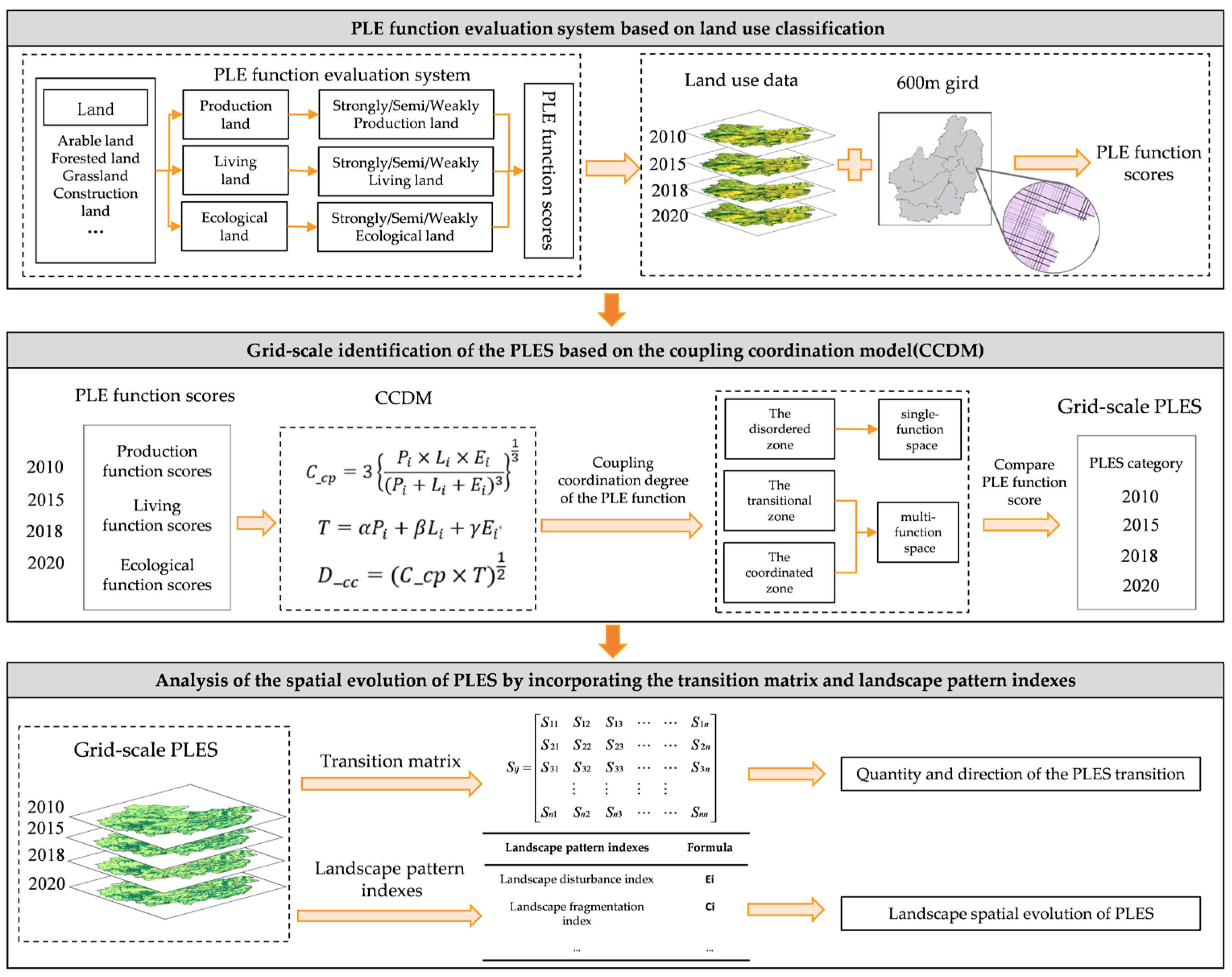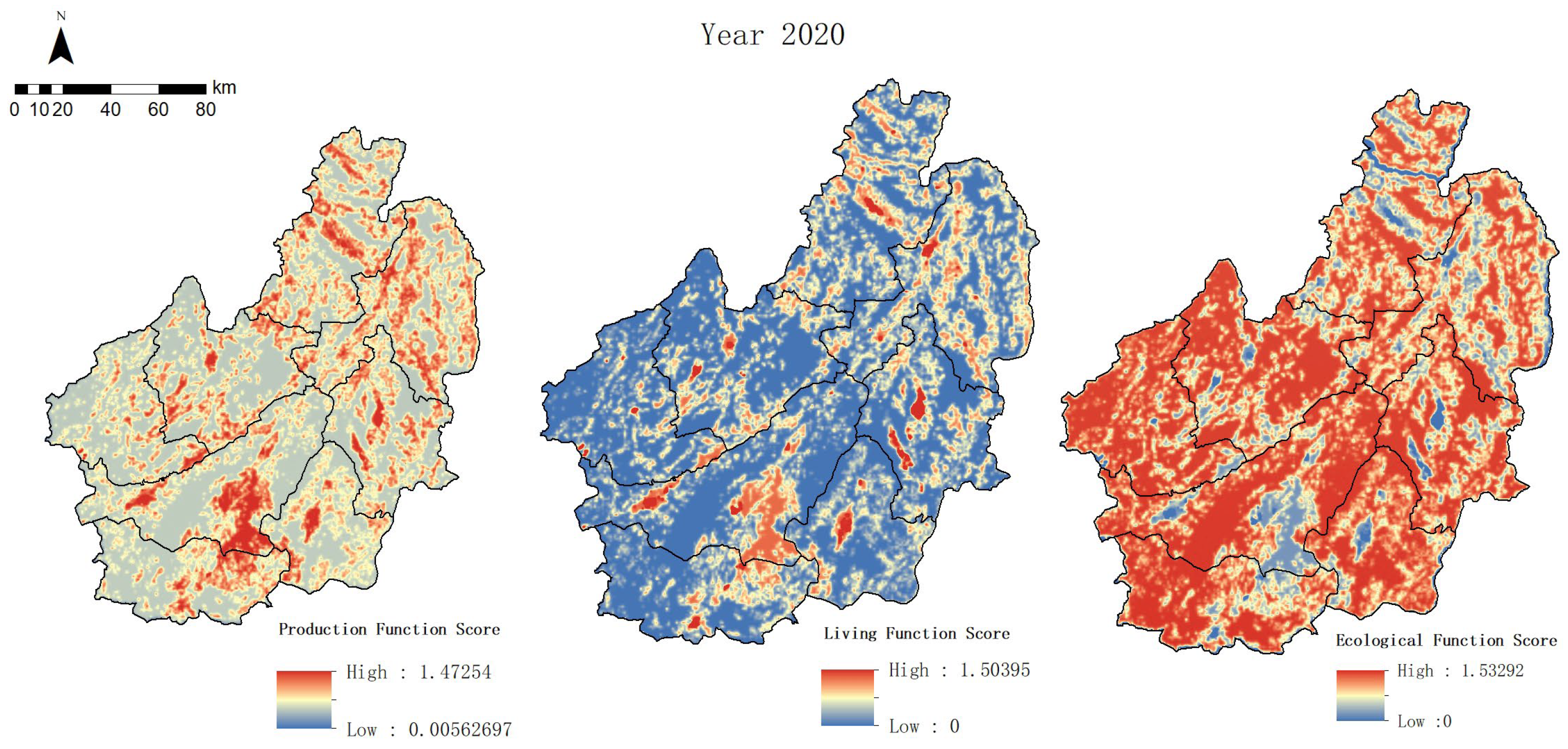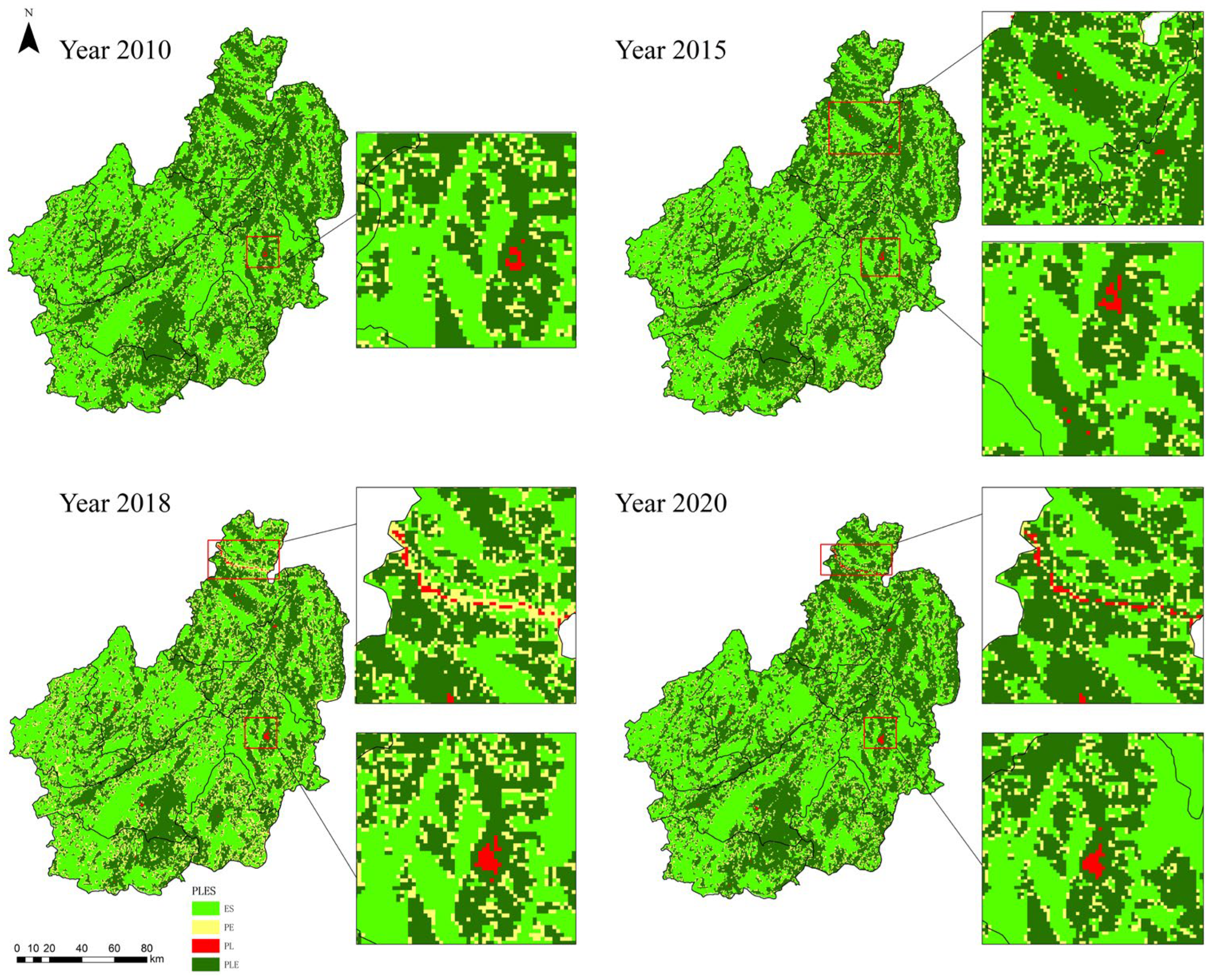 - Using Lincang City as a case study, the study completes a four-stage (2010, 2015, 2018, 2020) evaluation of production, living, and ecological functions, the calculation of coupling coordination degrees, and the grid-scale identification of PLES. This dataset establishes a temporal–spatial sequence that provides an empirical foundation for analyzing the dynamic evolution of multifunctional land use in mountainous regions.