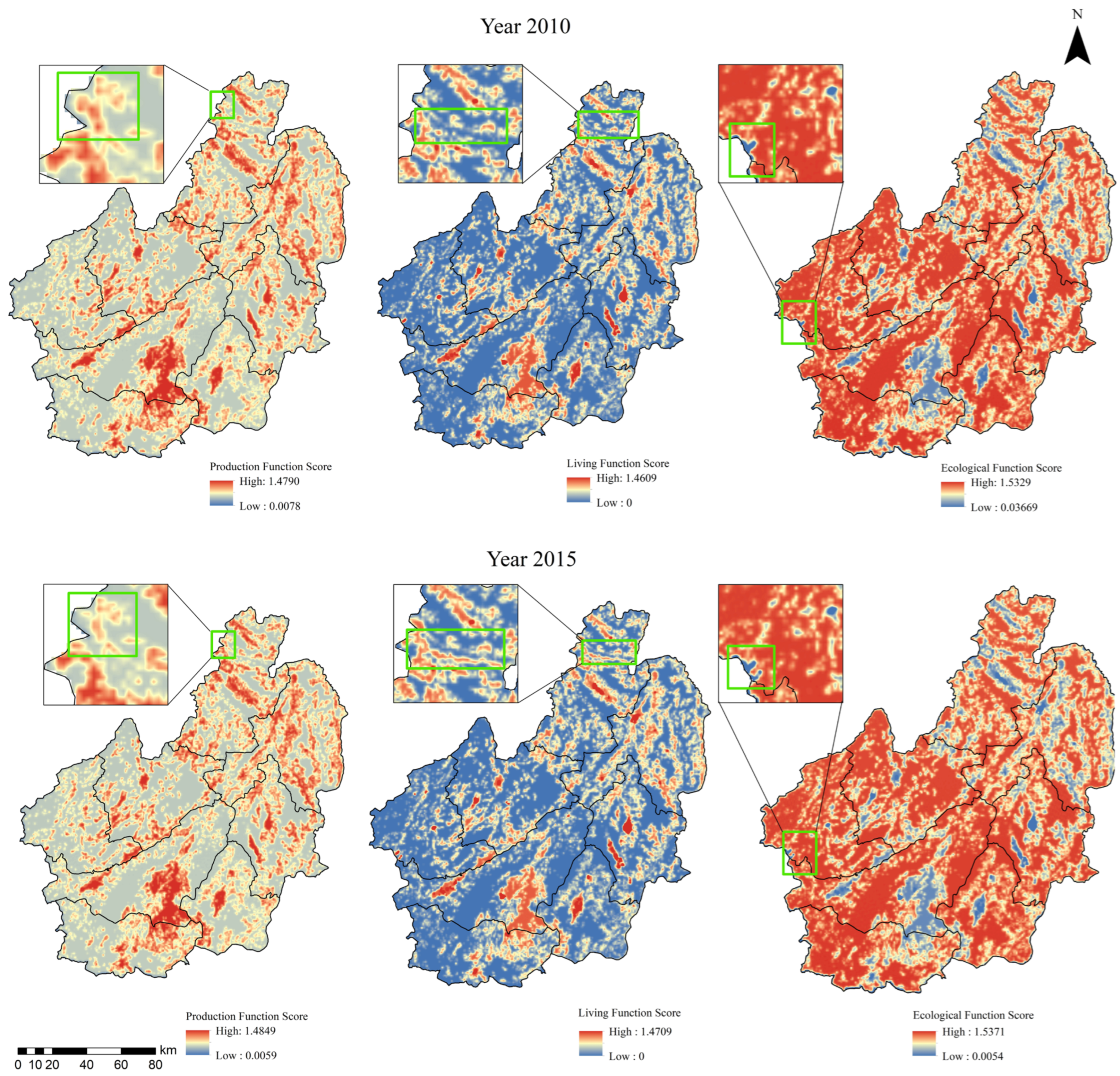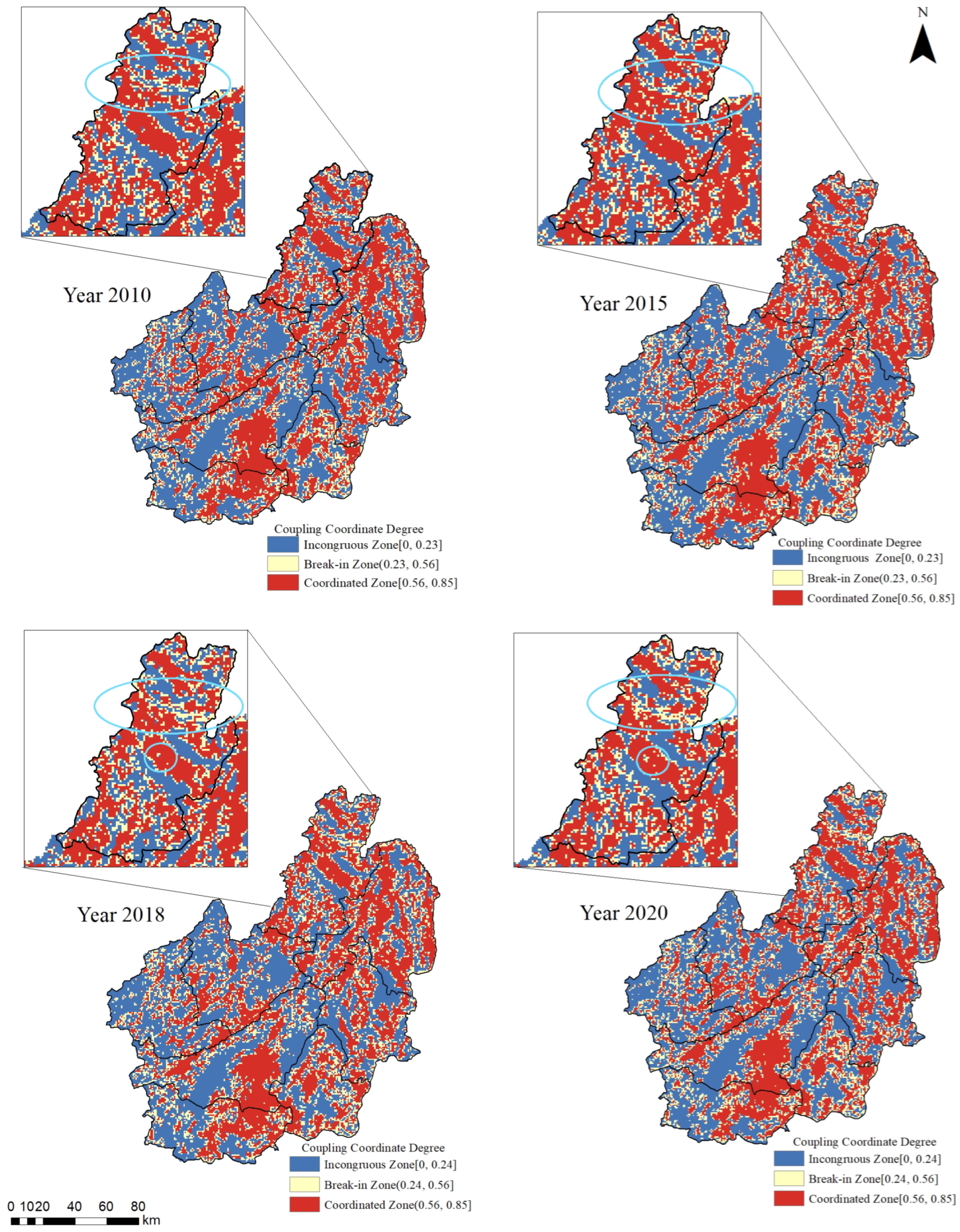 - Wang, D.; Jiang, D.; Fu, J.; Lin, G.; Zhang, J. Comprehensive assessment of production-living-ecological space based on the coupling coordination degree model. Sustainability 2020, 12, 2009. [Google Scholar] [CrossRef]