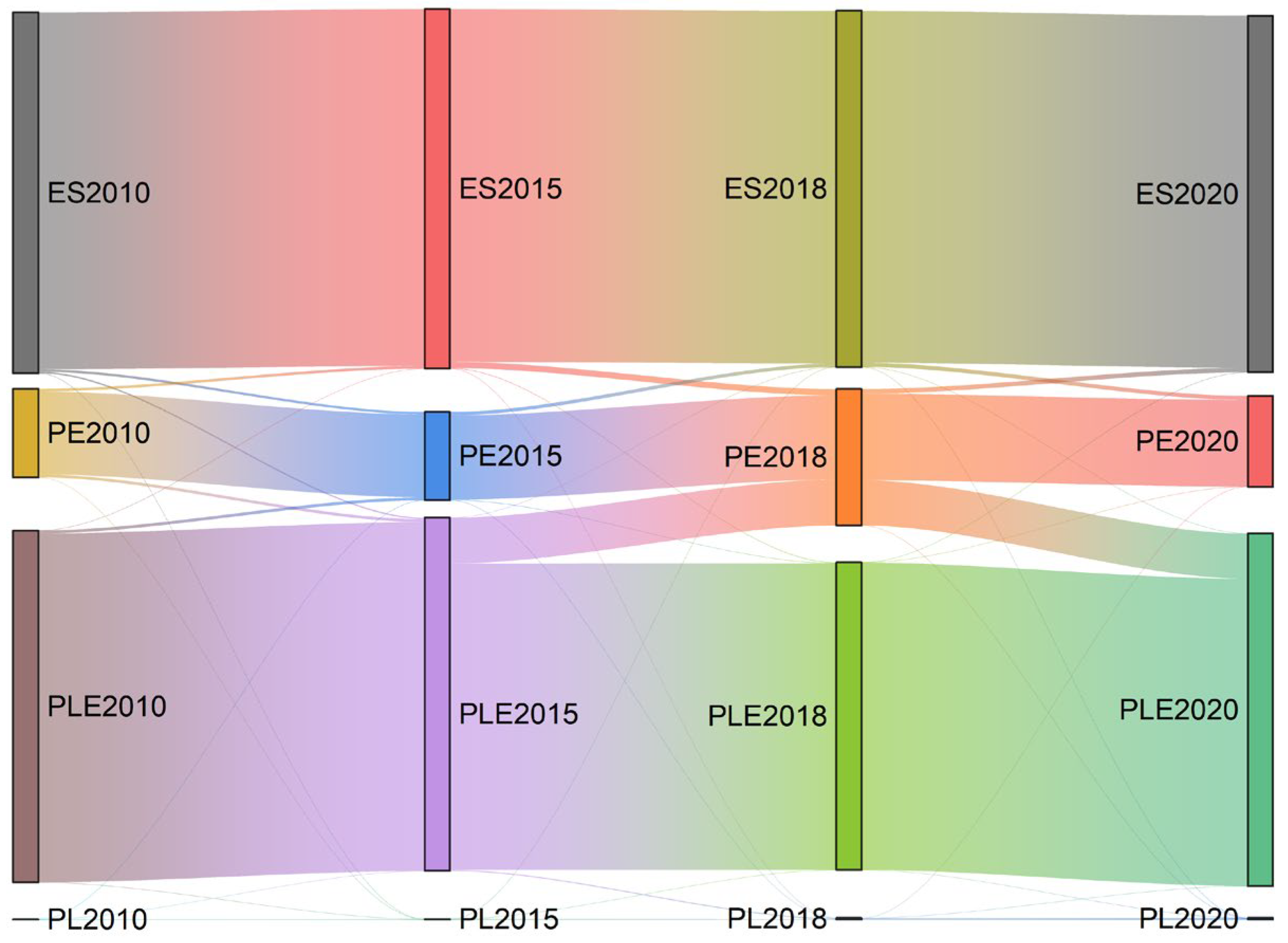 3.3.1. Analysis of the Evolutionary Pattern of PLES Types Based on Transition Matrix