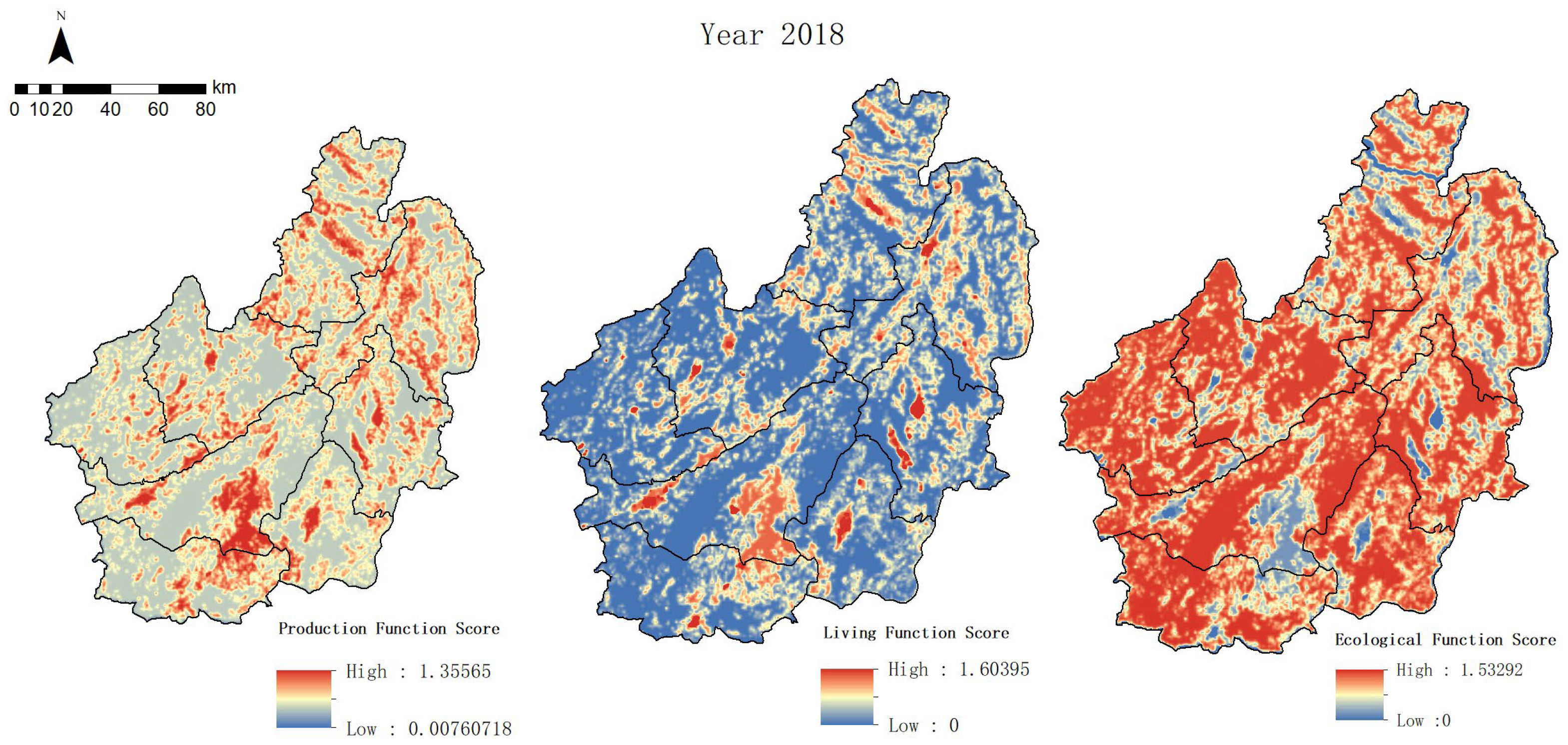 - A refined identification framework for production–living–ecological spaces (PLES) is developed by integrating the functional scoring model with the coupling coordination degree model. Unlike previous studies that rely solely on land use classification or single-function assessment, the proposed approach simultaneously quantifies the intensity of production, living, and ecological functions and evaluates their interrelationships. This dual-dimensional assessment—combining function strength and coordination degree—enables more systematic and fine-grained scale recognition of PLES at a 600 m, thereby alleviating some limitations associated with conventional coarse-grained classifications.