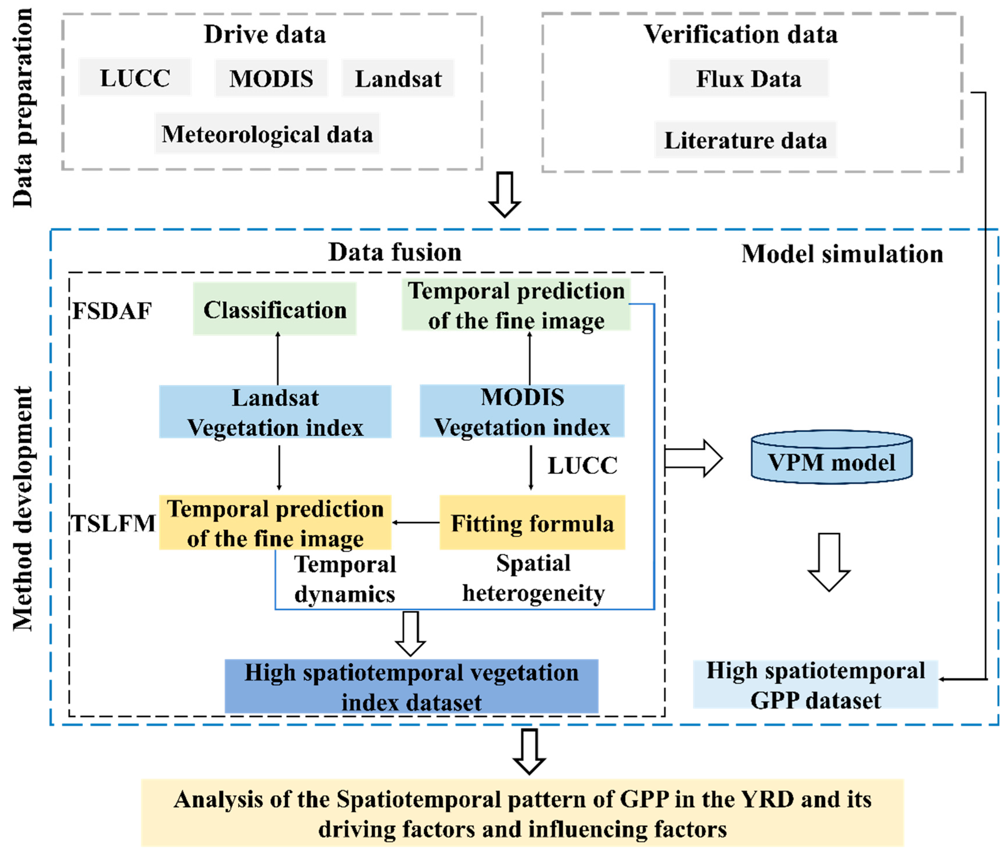 Chicago/Turabian StyleMai, Ziqi, Pan Li, Xiaomin Sun, Qian Chen, Chongbin Xu, Buli Cui, Yu Wu, Bin Wang, and Zhongen Niu. 2026. "High-Spatiotemporal-Resolution GPP Mapping via a Fusion–VPM Framework: Quantifying Trends and Drivers in the Yellow River Delta from 2000 to 2021" Land 15, no. 1: 184. https://doi.org/10.3390/land15010184