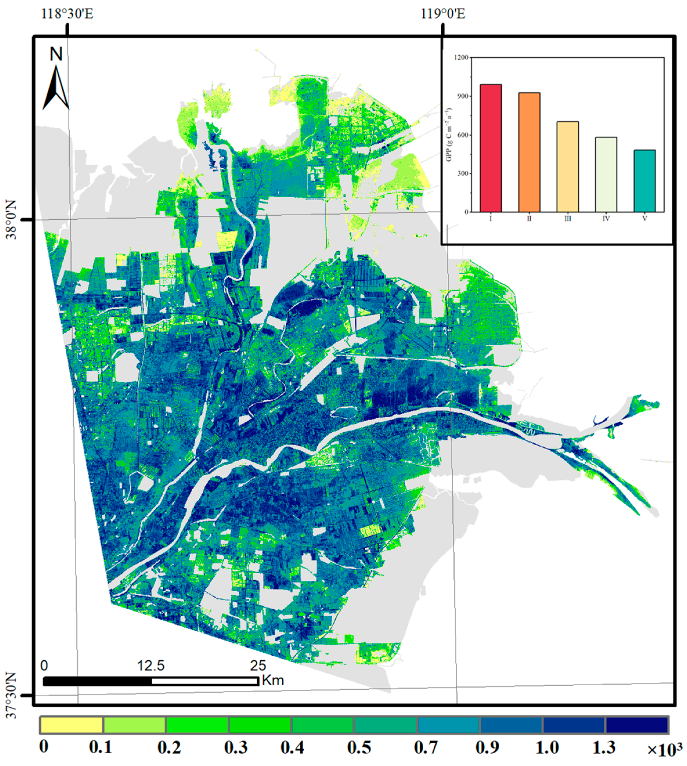3.2. Spatial Distribution of GPP