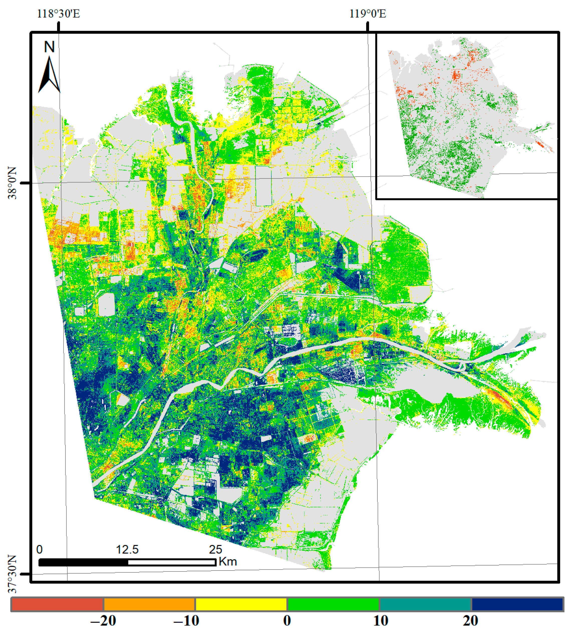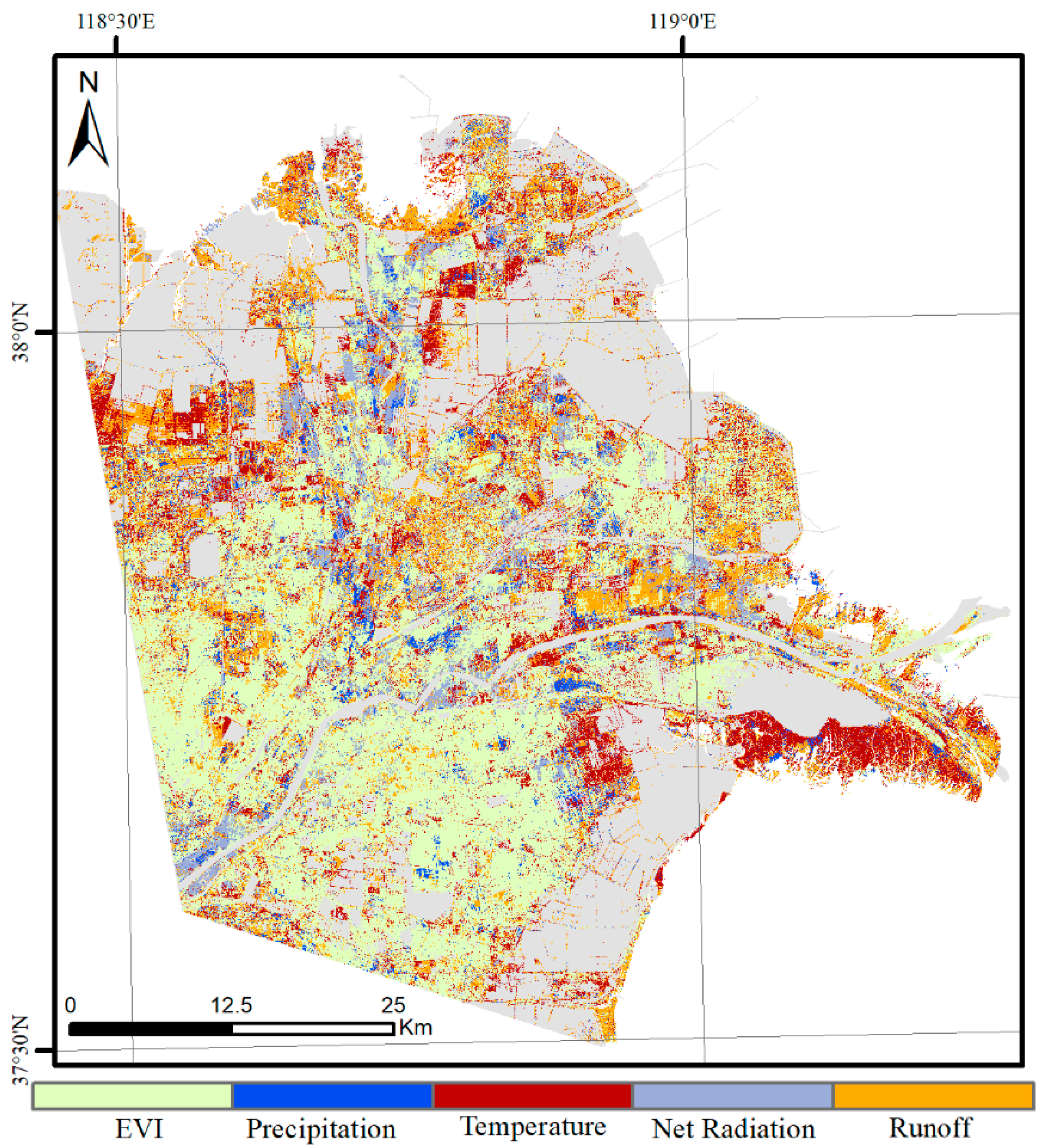 - Cui, L.; Li, G.; Zhao, M.; Xu, X. Natural and anthropogenic contributions to the landscape evolution in the Yellow River Delta wetland, China. Glob. Ecol. Conserv. 2024, 56, e03347. [Google Scholar] [CrossRef]