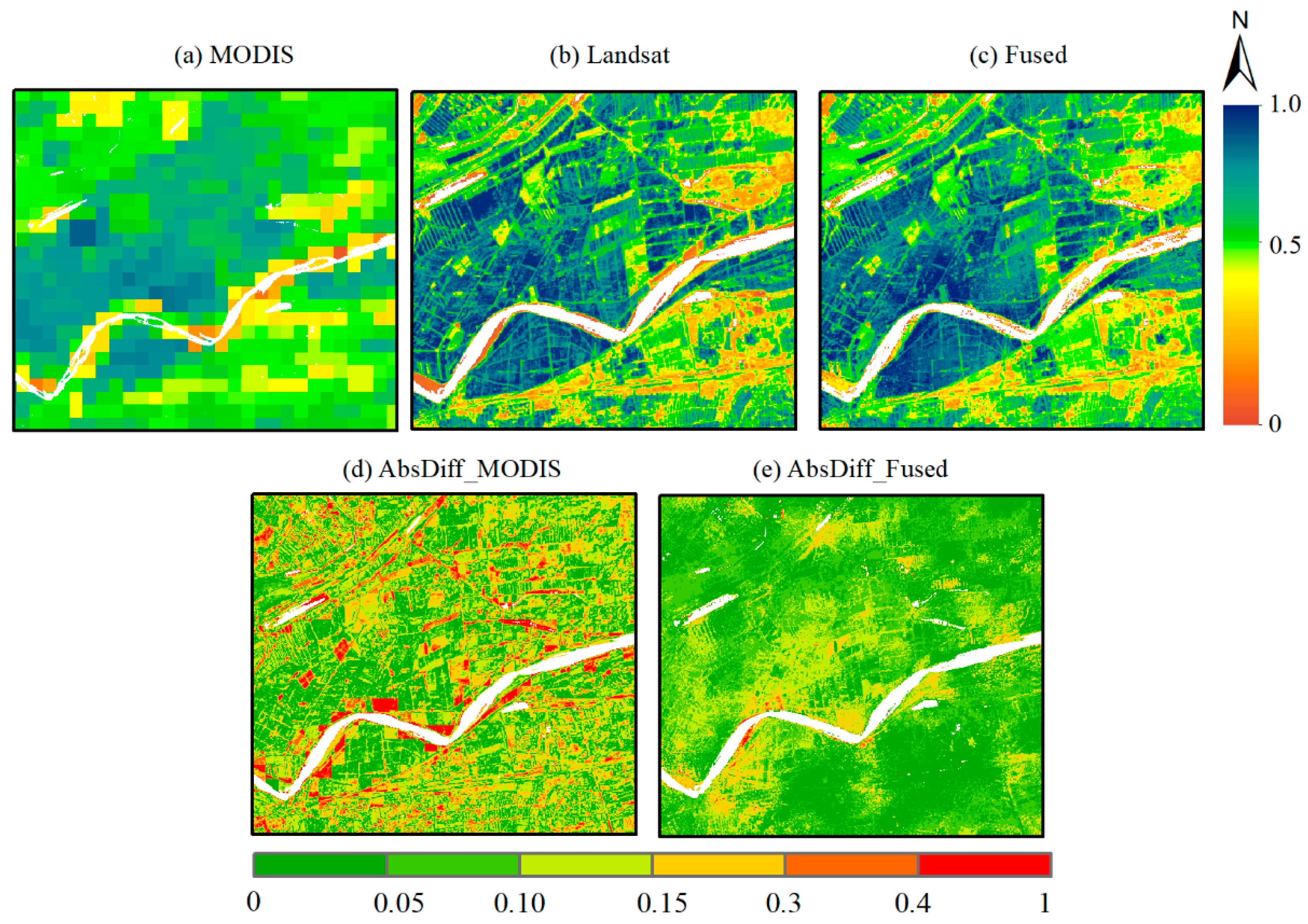 - Zhu, X.; Helmer, E.H.; Gao, F.; Liu, D.; Chen, J.; Lefsky, M.A. A flexible spatiotemporal method for fusing satellite images with different resolutions. Remote Sens. Environ. 2016, 172, 165–177. [Google Scholar] [CrossRef]