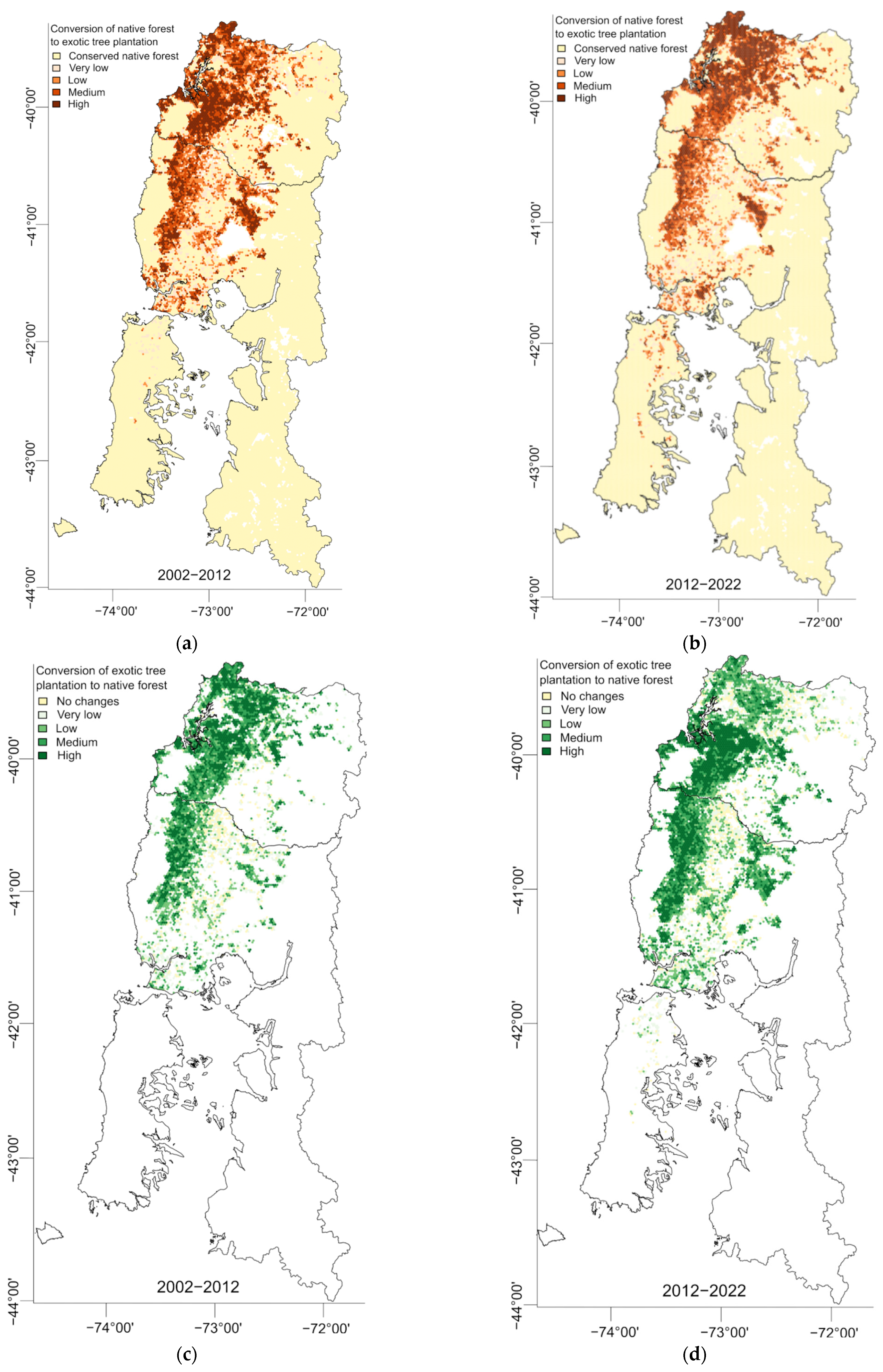 - Zamorano-Elgueta, C.; Rey Benayas, J.M.; Cayuela, L.; Hantson, S.; Armenteras, D. Native forest replacement by exotic plantations in southern Chile (1985–2011) and partial compensation by natural regeneration. For. Ecol. Manag. 2015, 345, 10–20. [Google Scholar] [CrossRef]