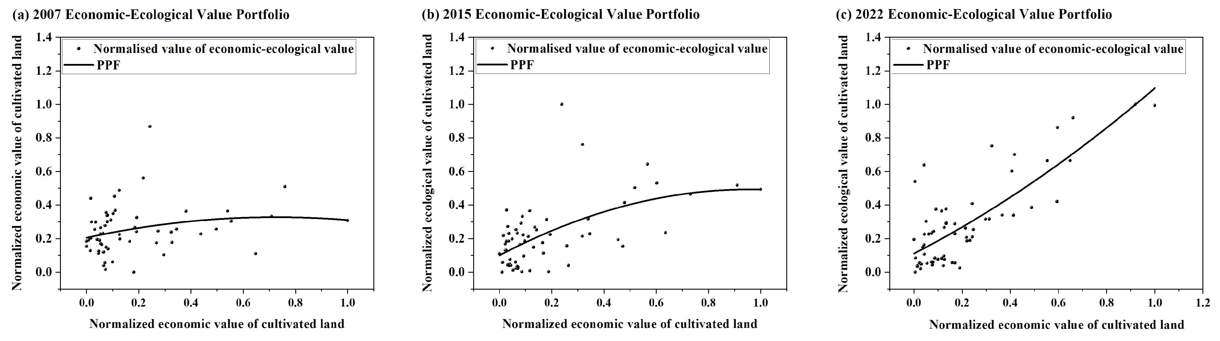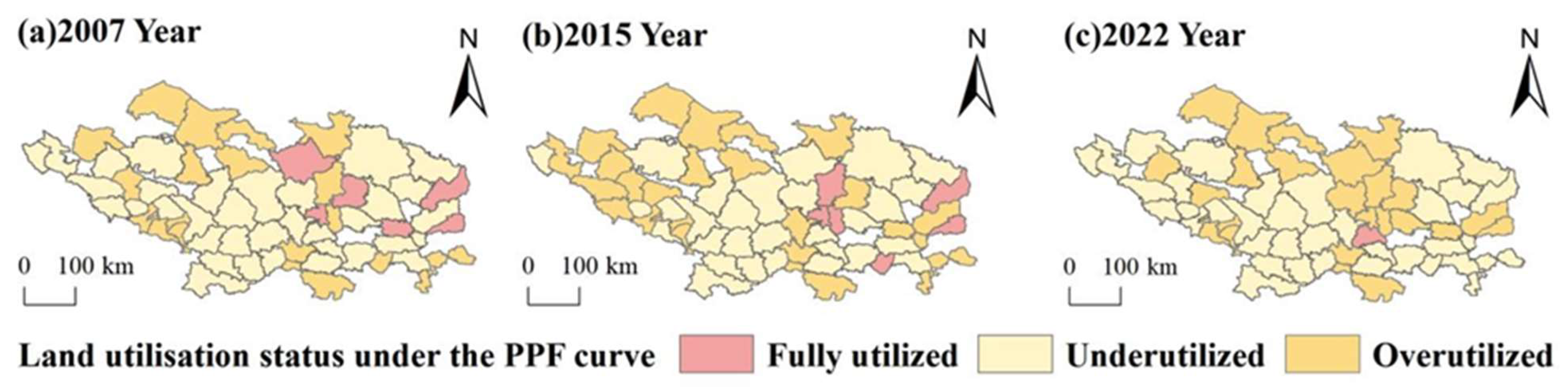 2.4.4. Trade–Off/Synergy Analysis of Cultivable Land Resource Value Based on the PPF