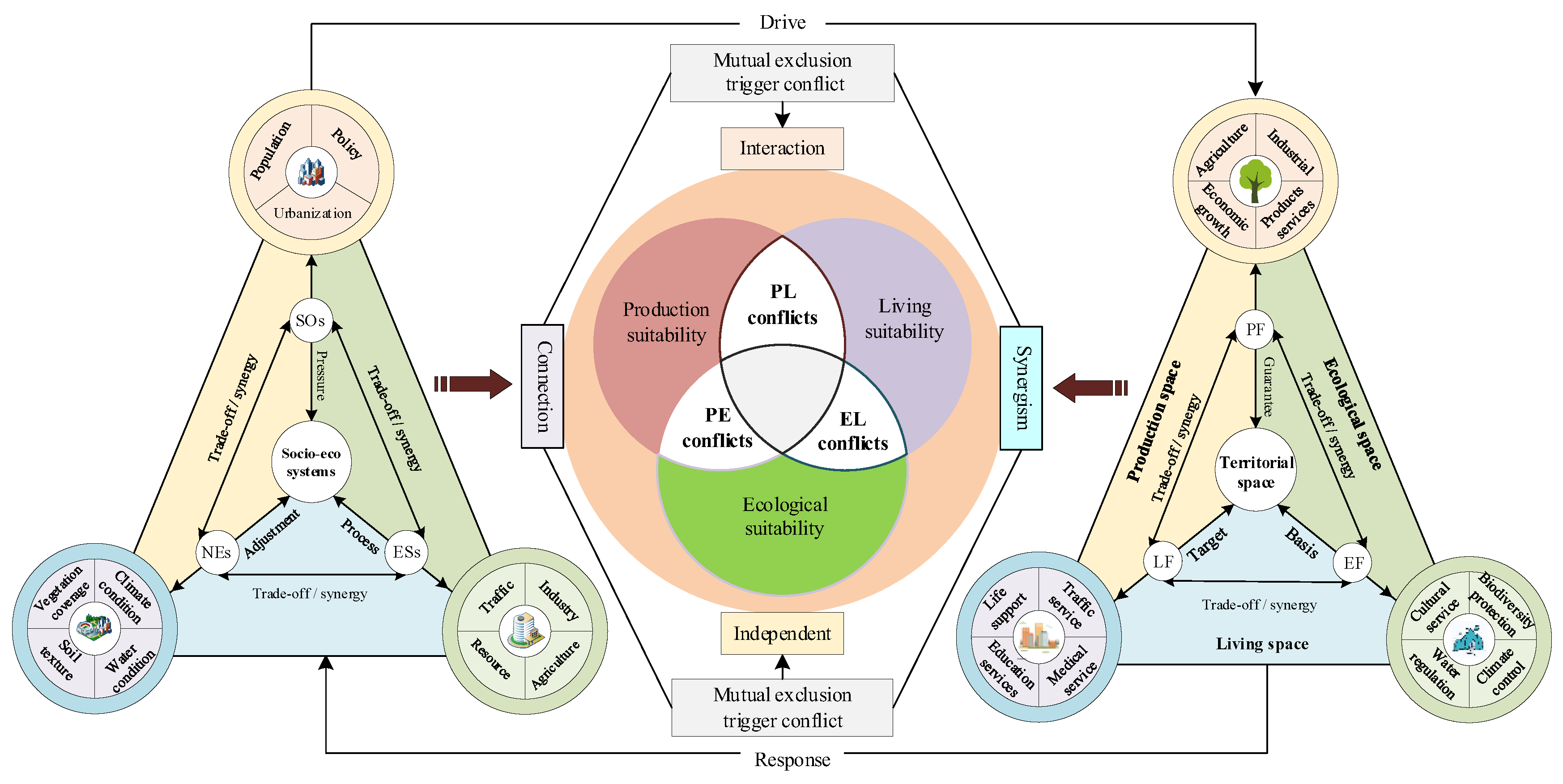 - Zhang, L.; Hou, Q.; Duan, Y. A literature review on production-living-ecological spaces in the context of ecological civilization: Connotation, problems and countermeasure. Acta Ecol. Sin. 2024, 44, 47–59. (In Chinese) [Google Scholar] [CrossRef]