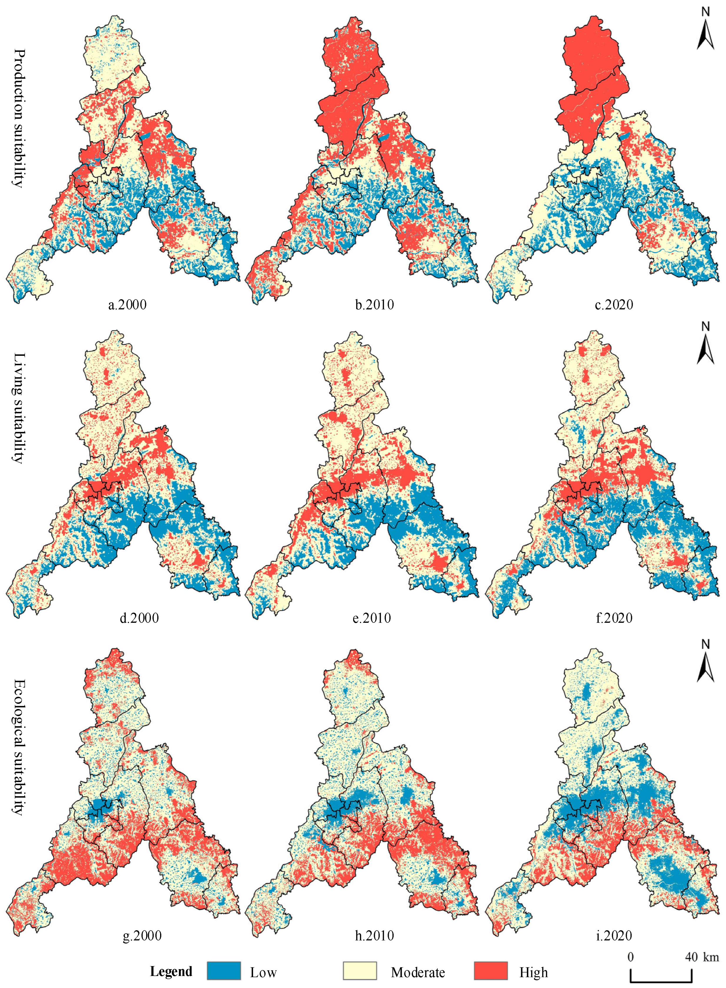 - Significant spatial heterogeneity characterized the suitability of production–living– ecological space in Jinan City from 2000 to 2020. High suitability zones of production and living space expanded in the northern plain along the Yellow River and central piedmont plain, respectively, while high suitability zones of ecological space contracted in the southern mountainous and hilly areas.